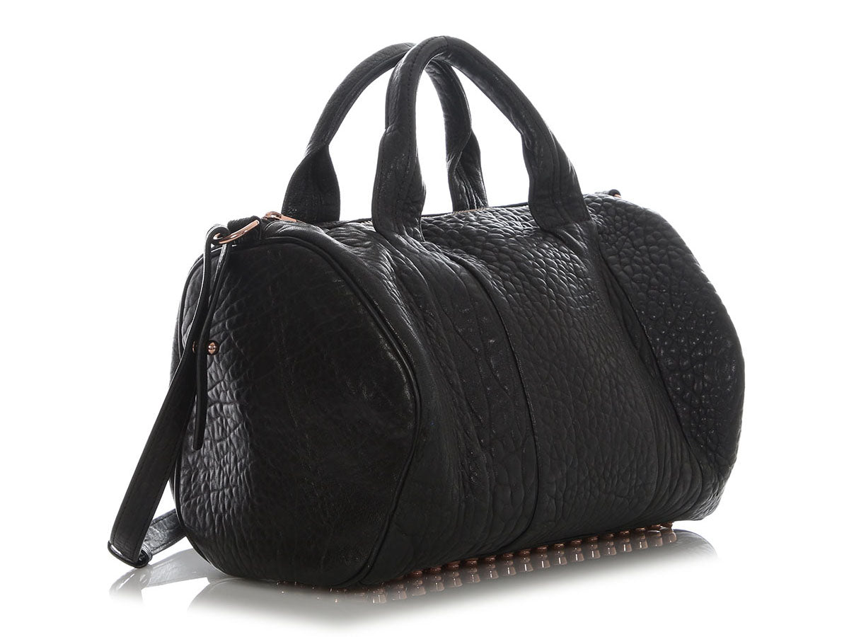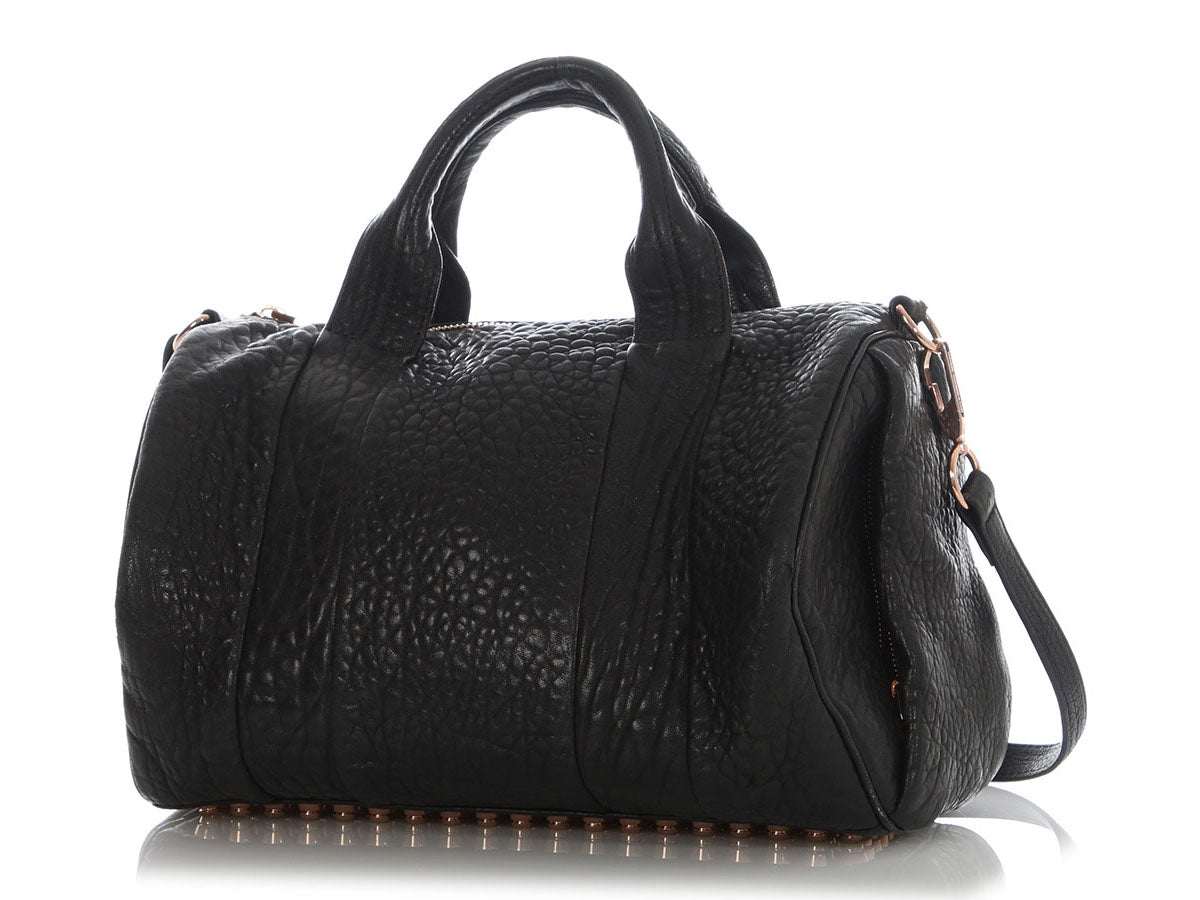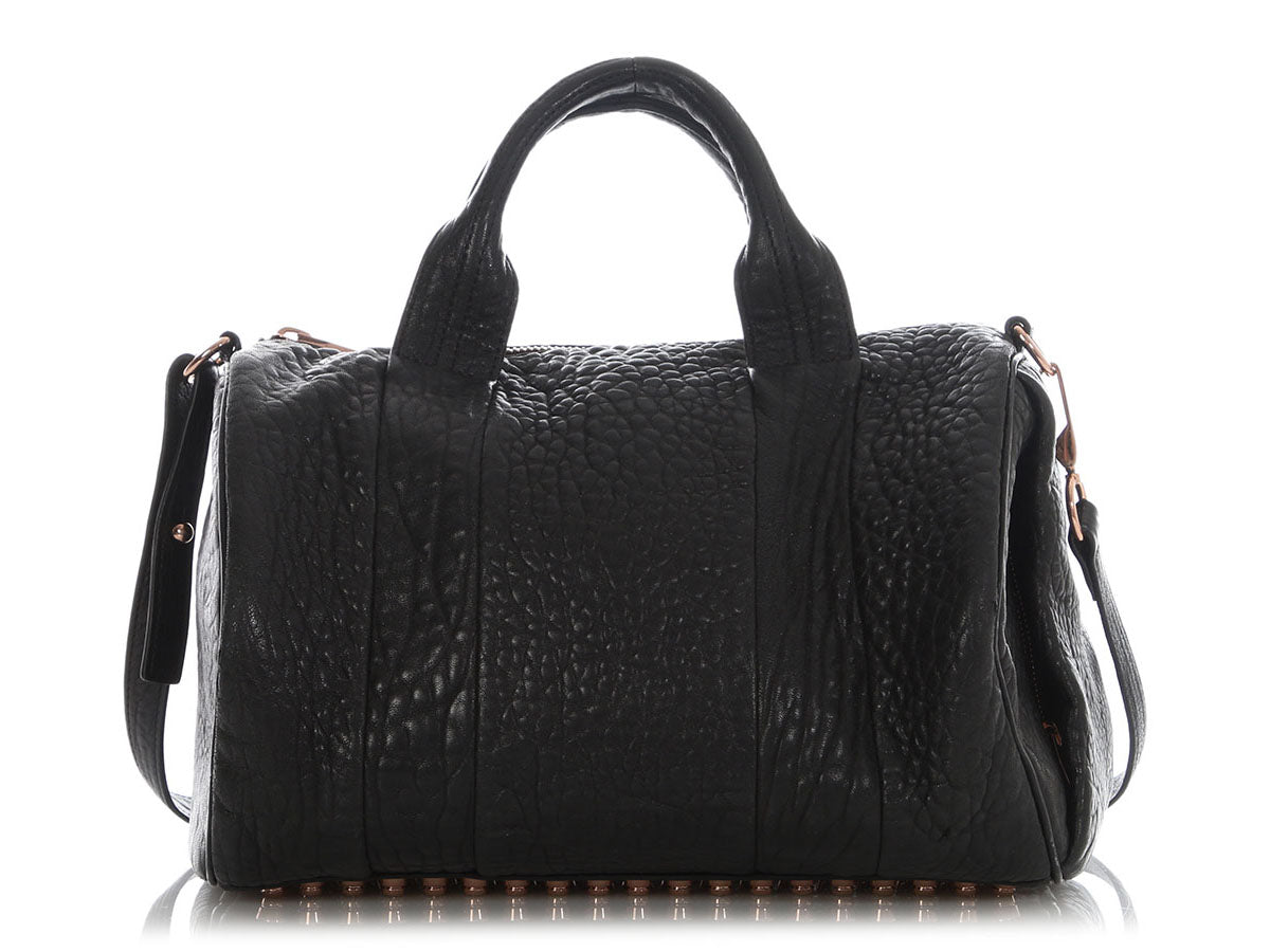 Alexander Wang’s Mini Black Pebbled Lambskin Rockie stands proud on four rows of rose gold stud feet! Made of thick, bubbly, heavily pebbled leather, this barrel-shaped duffel can be carried by the top handles which have a 3-inch drop or slung over your shoulder with the adjustable, detachable strap shown with a 17.5-inch drop. The top unzips to reveal a black fabric-lined interior with one zipped and two slide pockets. Previously loved with a dustbag, it has wear on the corners, hardware, and shoulder pad part of the strap, heavy wear and damage on both edges (the left side is worse than the right), white marks inside, and a musty odor. Who needs diamonds on the soles of their shoes when you can have shiny rose gold as feet!