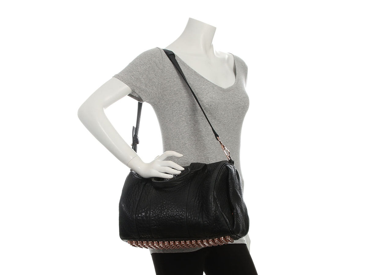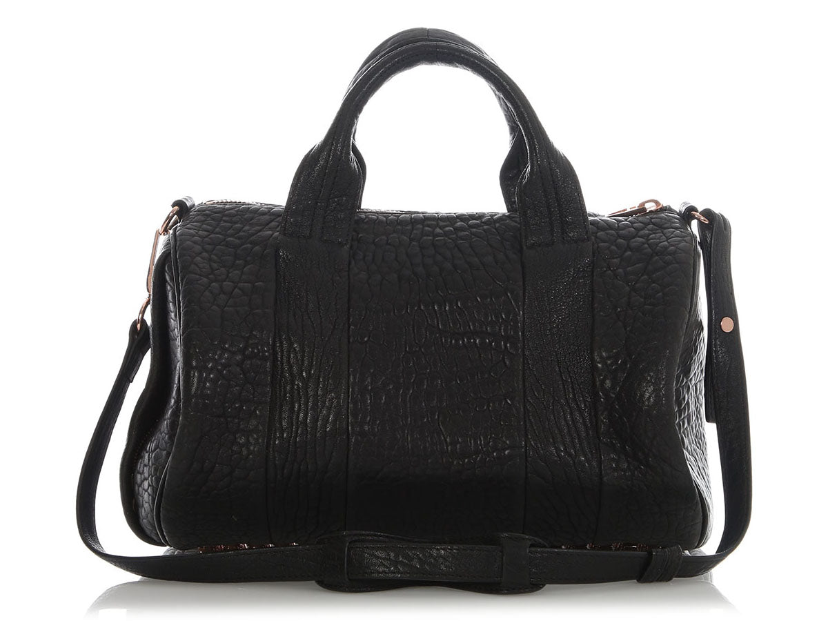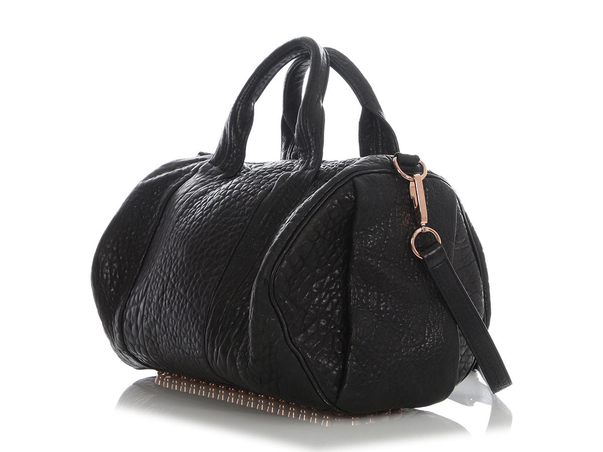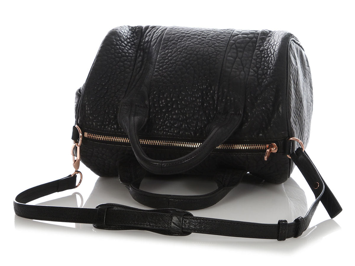Alexander Wang’s Mini Black Pebbled Lambskin Rockie stands proud on four rows of rose gold stud feet! Made of thick, bubbly, heavily pebbled leather, this barrel-shaped duffel can be carried by the top handles which have a 3-inch drop or slung over your shoulder with the adjustable, detachable strap shown with a 17.5-inch drop. The top unzips to reveal a black fabric-lined interior with one zipped and two slide pockets. Previously loved with a dustbag, it has wear on the corners, hardware, and shoulder pad part of the strap, heavy wear and damage on both edges (the left side is worse than the right), white marks inside, and a musty odor. Who needs diamonds on the soles of their shoes when you can have shiny rose gold as feet!