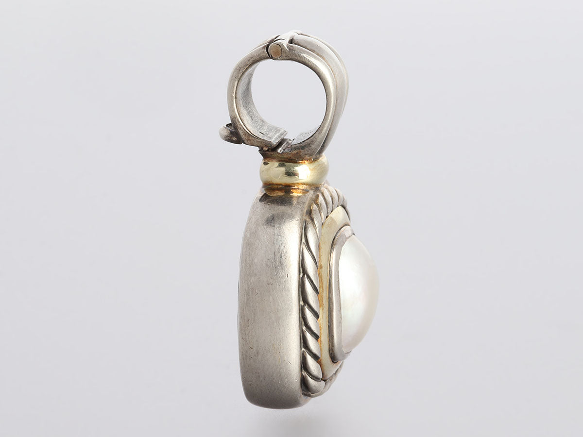 From the Albion collection, this David Yurman Two-Tone Pearl Enhancer is just the right accent for a chain, cord, ribbon, or string of pearls! A mabé pearl, also known as a blister pearl, is set in plain and cable sterling silver and 14K yellow gold. It hangs from a bail that opens to fit up to 8 millimeters. Previously loved, it has scratches on the metal. In true Yurman style, the back of the piece is as intricate as the front. This medium pendant is a classic and definitely ready to highlight your graceful neck!
