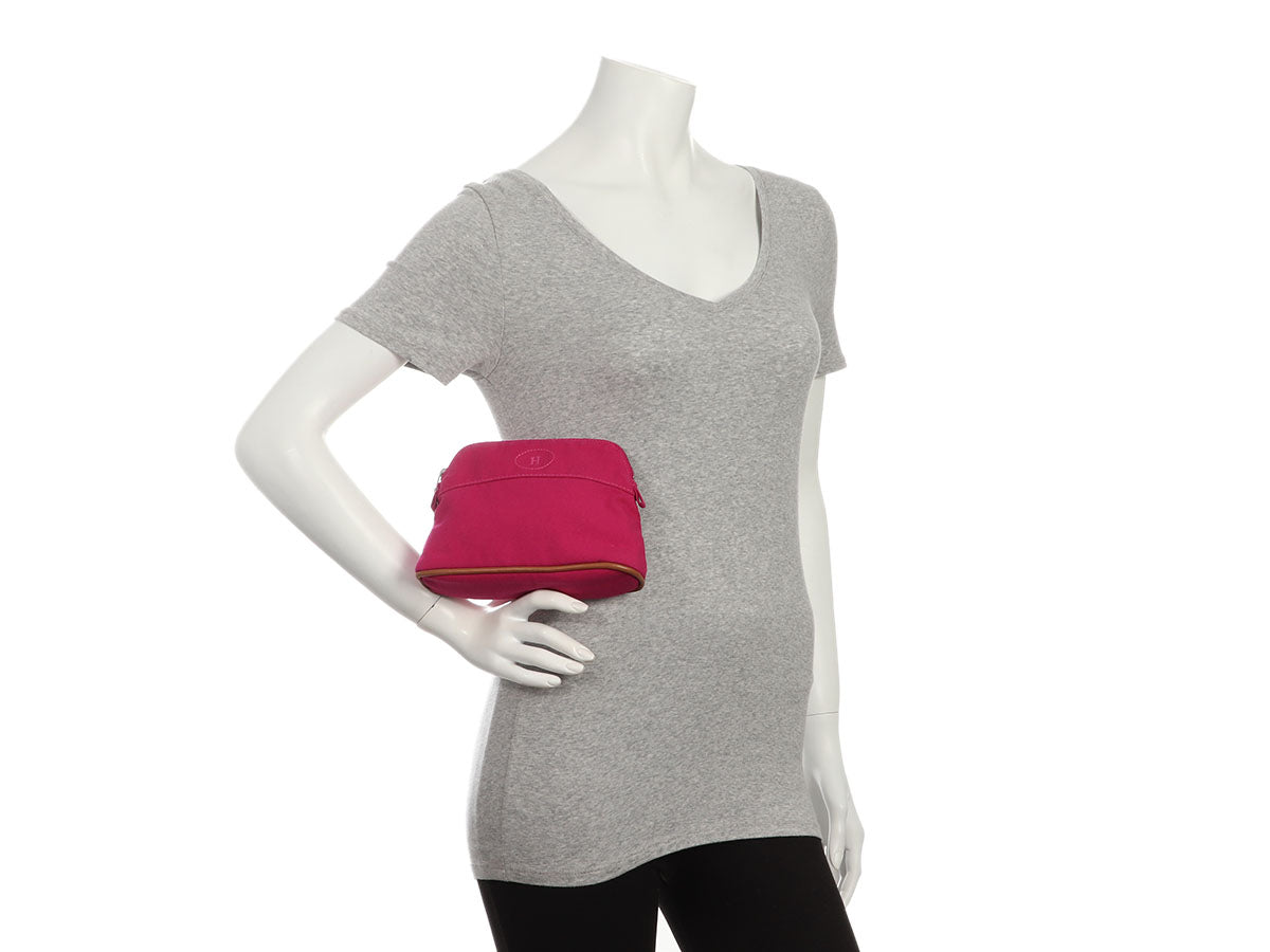 Hermès’ Pink Canvas Bolide Cosmetic Case is a generously sized accessory that could pass as a fashionable clutch in a heartbeat! This Bolide crossbody look-alike is made of pretty pink canvas with brown-leather trim. The palladium zippered top opens to orange-fabric lining with no pockets inside. In great condition, it comes with a dustbag and box and has a bit of wear inside and is a bit rumpled. The embroidered H on the front face gives away its heritage!