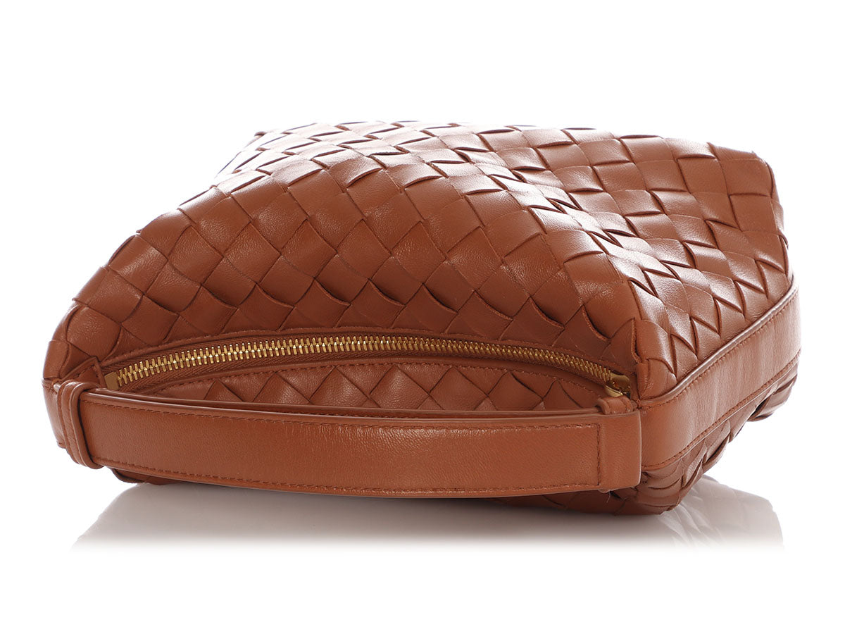 Bottega’s Mini Wood Intrecciato Wallace is a compact classic in the house’s signature woven leather! Crafted from soft brown leather with gold hardware, it features a top handle with a 5-inch drop and a zippered top that opens up to reveal a pocketless interior lined in brown leather. In great condition with a dustbag, it has rubbing on the corners, scratches on the feet, and a few faint marks near the base. Small in size but rich in texture, this Mini Wallace makes a luxe everyday statement!