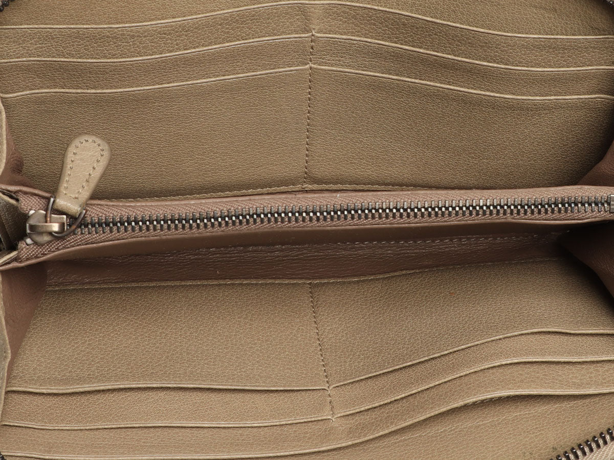 Bottega Veneta’s Beige Camo Embroidered Wallet is a roomy piece with loads of space for all your currency and cards! Made of woven leather in shades of beige and taupe, it’s stitched with different-colored threads creating a scaly snakeskin-like look. The gunmetal zipper runs three-quarters of the way around and opens up to reveal a taupe-leather-lined interior with a center zipped pocket, two slide pockets, and 12 card slots. In very good condition, it has indentations, stains, and scratches inside, wear on the corners, edges, and fabric around the zipper, and a musty smell. The neutral camouflage is discreetly chic!