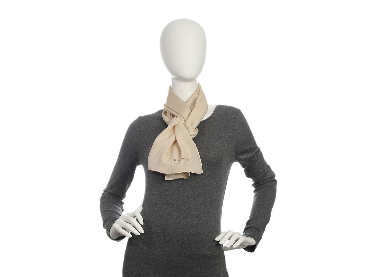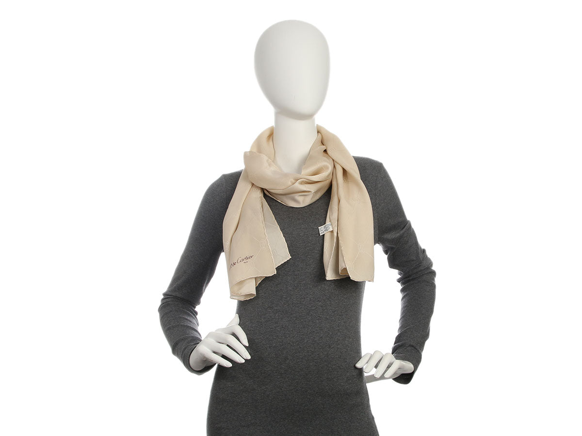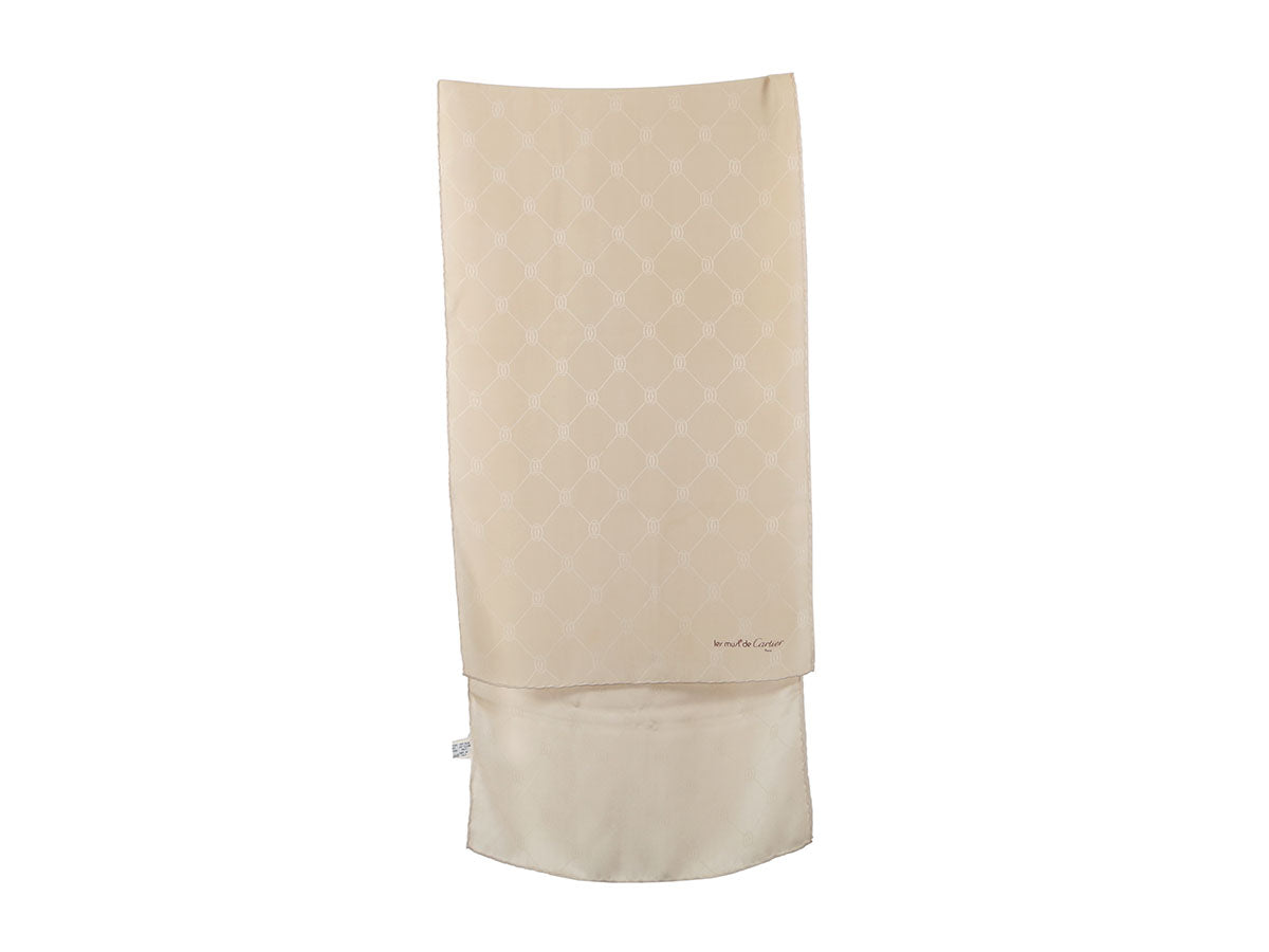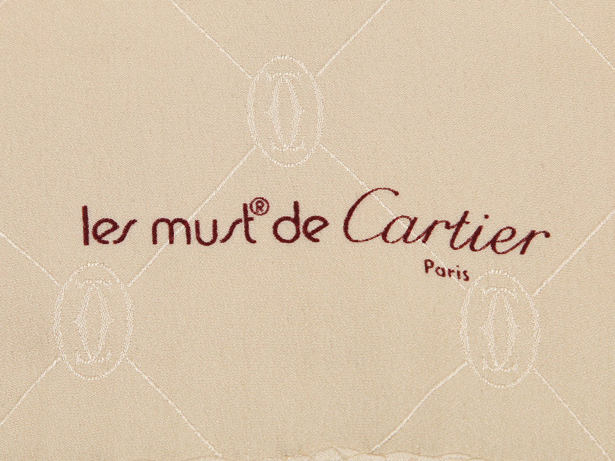Cartier’s Vintage Logo Silk Scarf has a classic look! Made of 100% silk cream silk, it’s a diamond pattern with Cartier logos where the lines intersect and “Les Must de Cartier” in red at one end. In good condition, it has a handful of runs, the hand-rolled edges are flat, a few tiny stains and a musty smell. A timeless style with classic Cartier sophistication!
