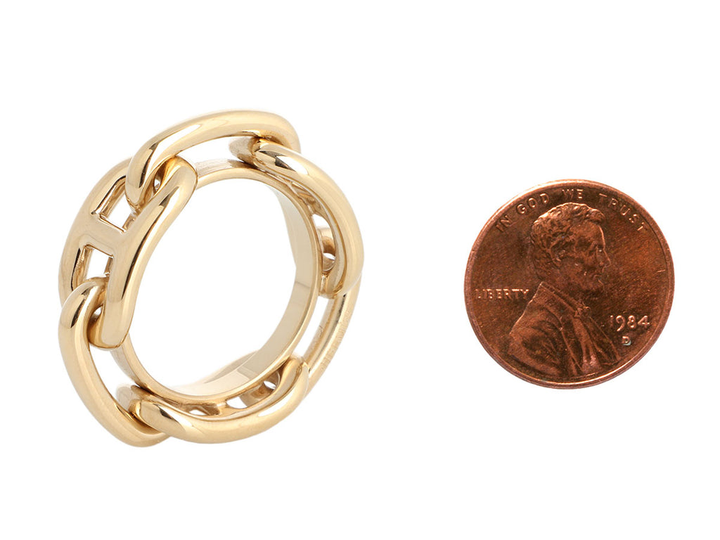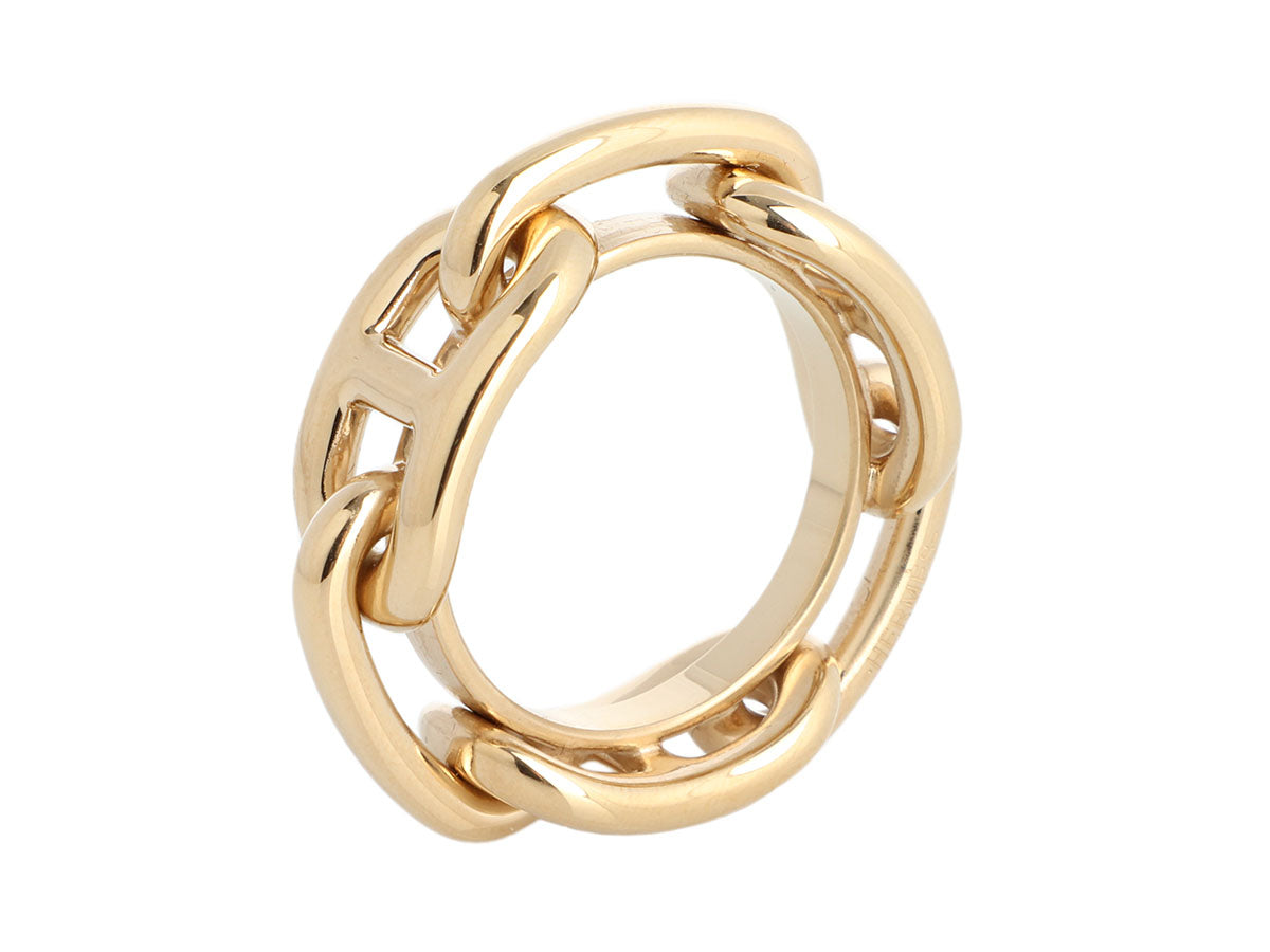 Hermès’ Gold Regate Scarf Ring is the perfect shining accessory to style your favorite silk carré! Composed of interlocking gold-tone Chaîne d'Ancre links, it comes brand new with a box. Cinch it, slide it, get creative with it!