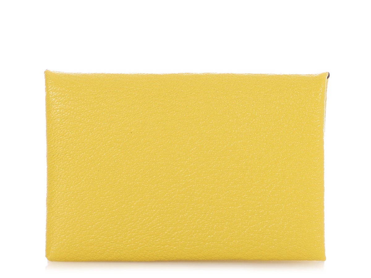 Hermès’ Jaune Chèvre Calvi Card Holder is a neat little case for IDs, business cards, change, clips, and the occasional safety pin! Made of one piece of leather, it folds in half and secures with a palladium snap. The interior is in tonal leather with two slide pockets. New and never worn and stamped with a D, it comes with a box. This case’s bright yellow color is like a beacon in a larger purse that can be located quicker than you can say Calvi!