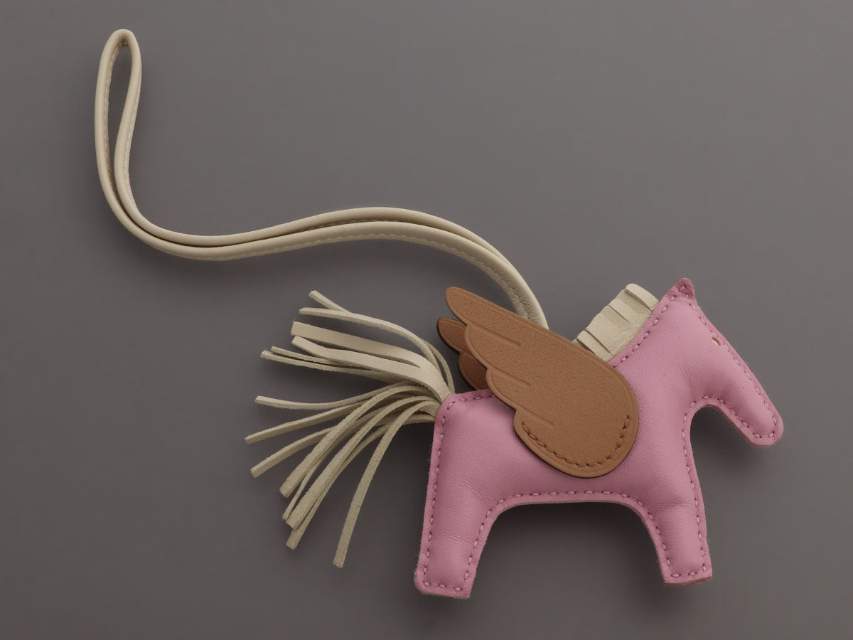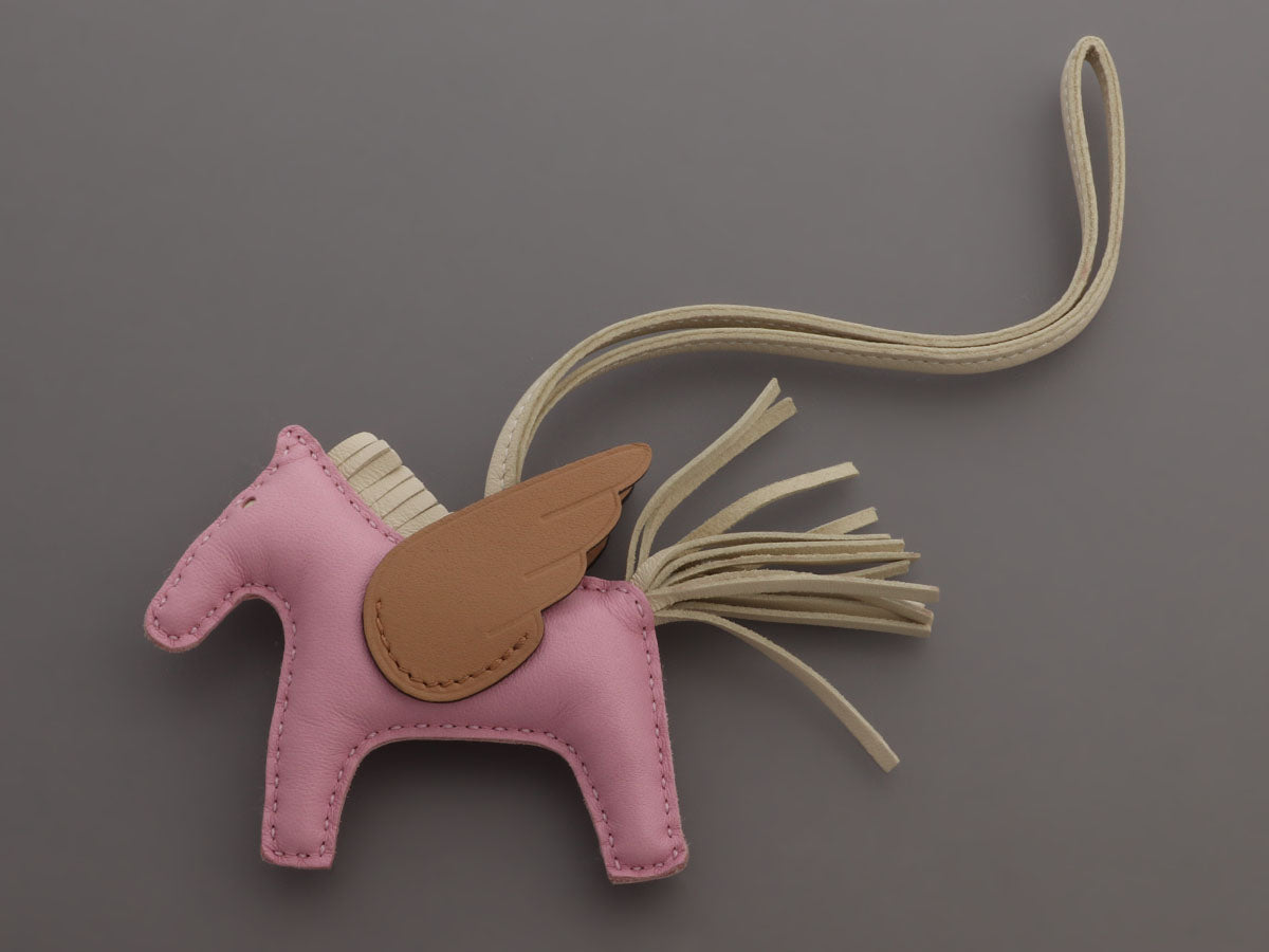 Hermès’ Mauve Sylvester Lambskin Rodeo Pégase PM is a sweet charm with a Neapolitan ice cream color palette! Crafted from soft Milo lambskin with no hardware, the padded body is Mauve Sylvester, the wings are Craie, and the mane, tail, and leash with a 7-inch drop are chai. There is a tiny bit of color transfer on the strap. Never worn from 2021 (Z stamp), it comes with a box and is the perfect accessory for a pink pony girl!