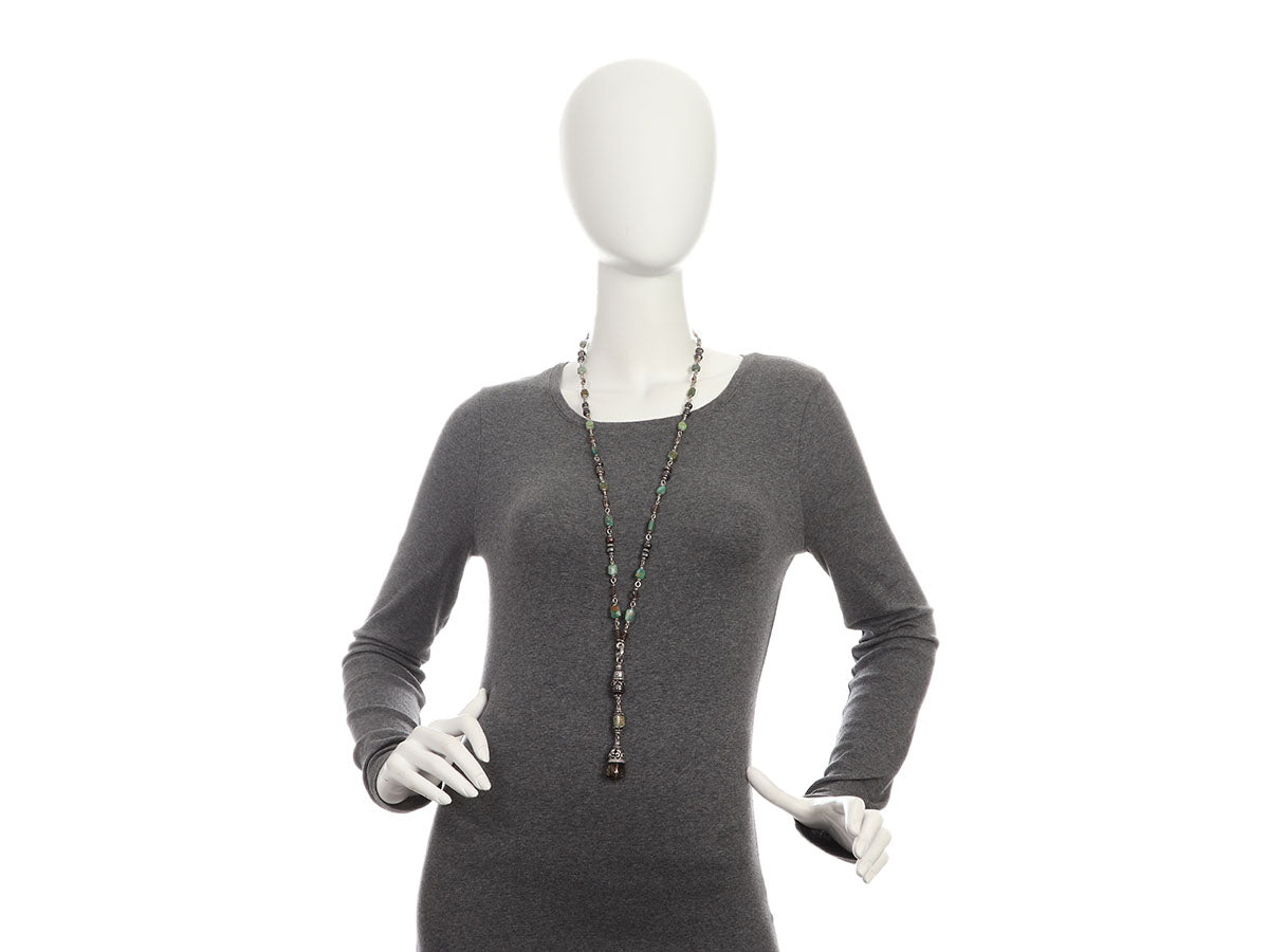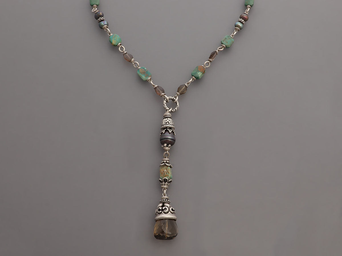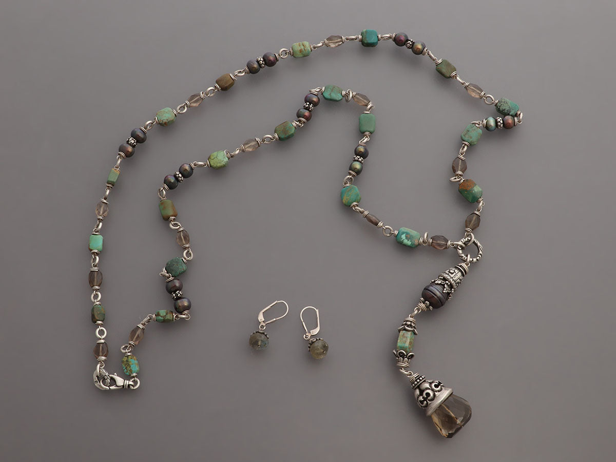 This Alana Leigh Sterling Silver Pearl and Turquoise Lariat Necklace features a pendant with a 4.75-inch drop and the lever-back pierced Labradorite Earrings have a 1.25-inch drop! In very good condition, all pieces are gently worn. The combination of smoky quartz, black pearl, Mediterranean turquoise, and Labradorite stones on a fine chain with a lobster clasp creates a stunning look that works for casual or formal wear!