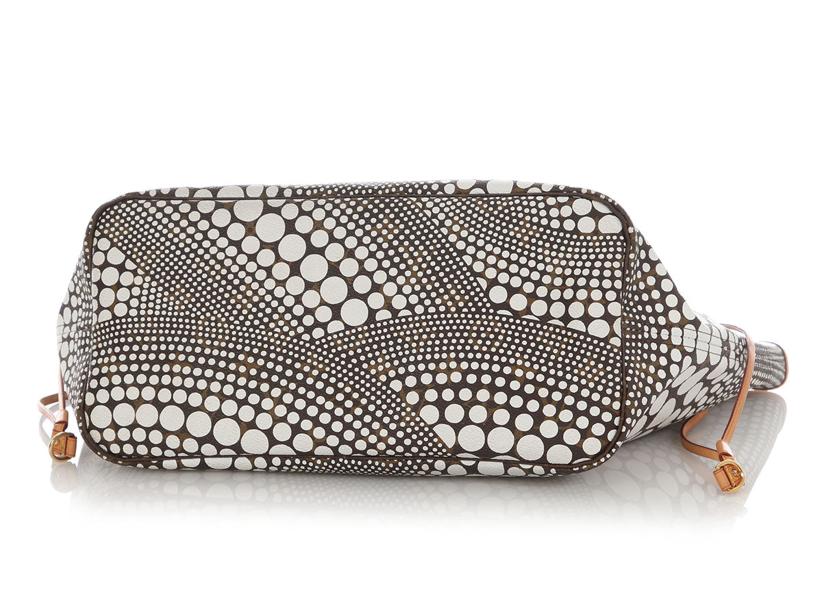 Yayoi Kusama’s signature dots move in currents across Louis Vuitton’s White Waves Neverfull MM! Made of traditional brown coated canvas printed with white spots, it has gold-tone hardware, natural leather trim, and dual leather handles with a drop of 8.75 inches. The top secures with an internal leash and inside you’ll find white-and-black printed fabric lining with one zipped pocket. In good condition, it has wear and patina on all the leather parts, scratches on the hardware, wear on the corners, edges, and inside, scuffs on the exterior (mostly on the sides), and heat-stamped “BRS” initial and a dog design at the bases of the handles. If you love limited-edition LVs, you’ll want to catch these Waves!