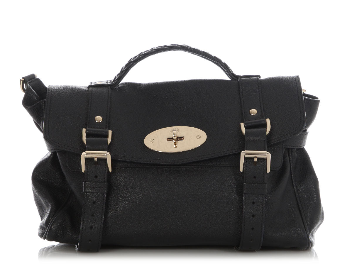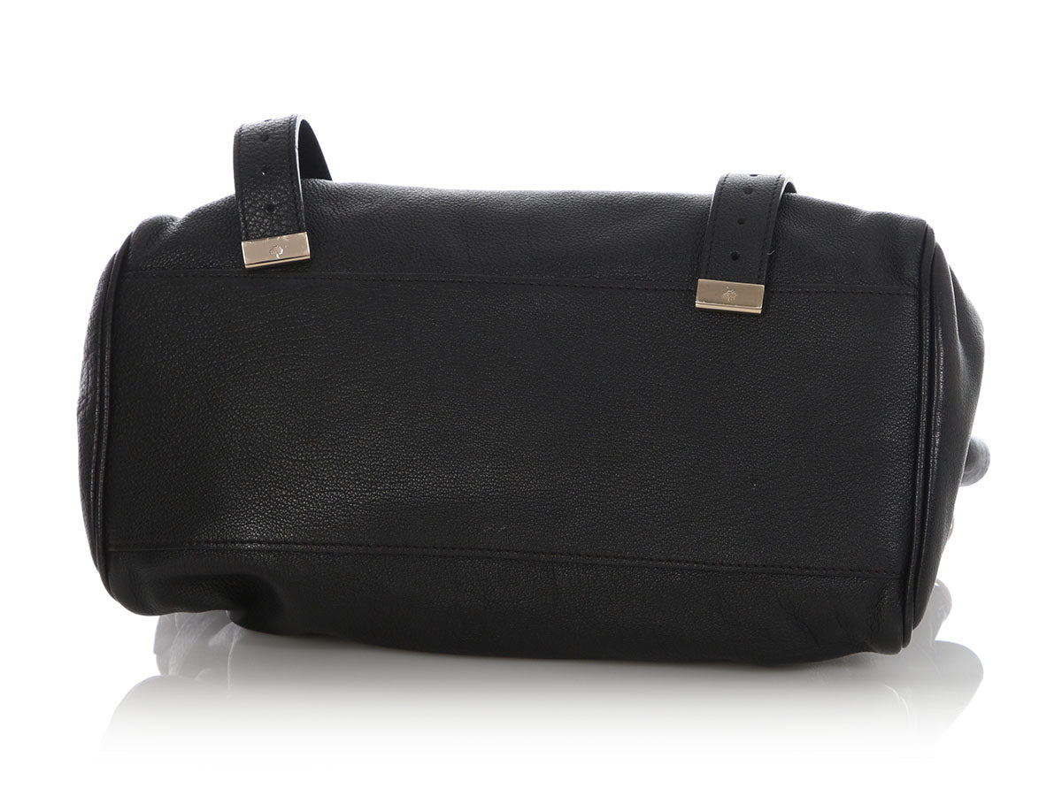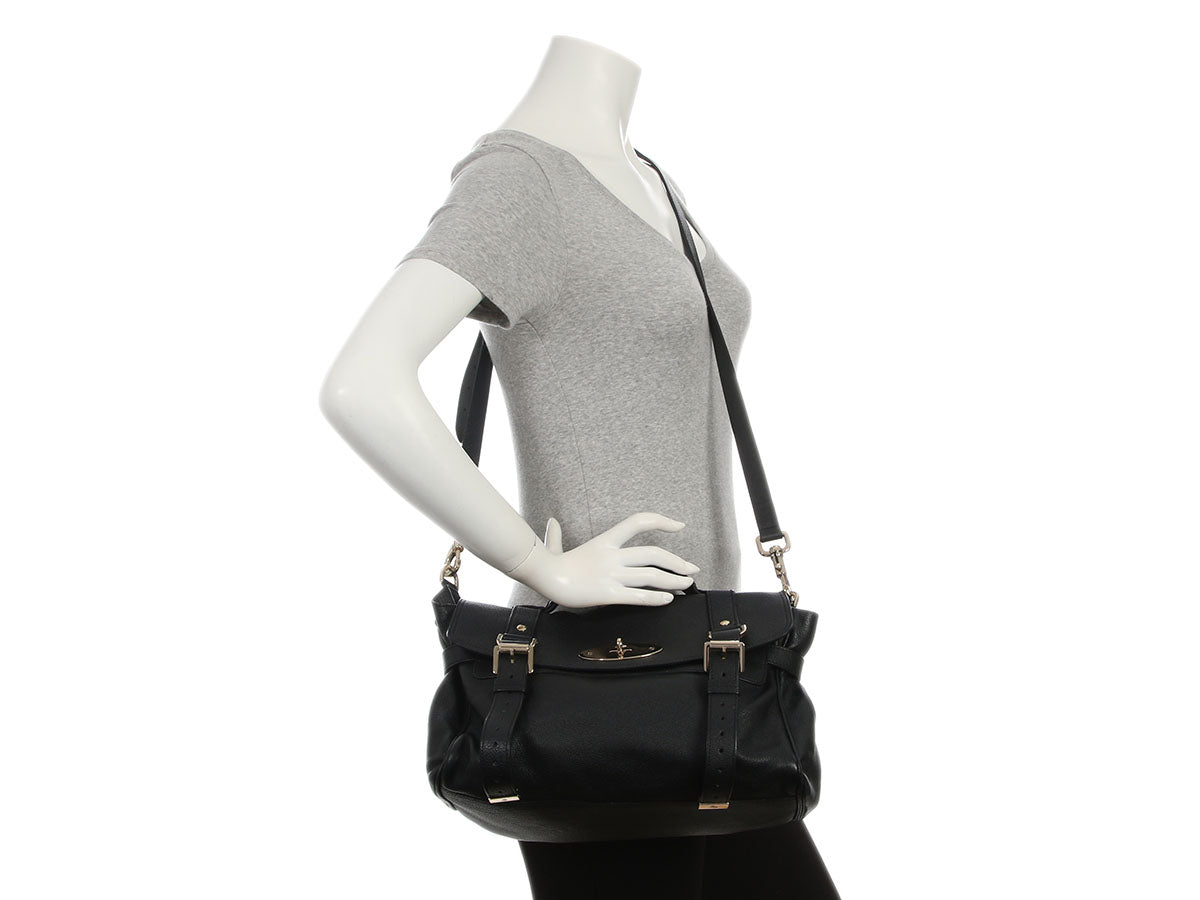 Mulberry’s Black Alexa is made of wonderfully slouchy, soft leather! The flap secures with a turn lock and two straps with magnetic snaps, opening to black suede and black fabric inside, as well as one zipped and one slide pocket. In great condition, the gold hardware has some scratches. The little top handle has a 1.25-inch drop, while the adjustable, detachable shoulder strap is shown with a 22-inch drop, giving this satchel some serious sway!