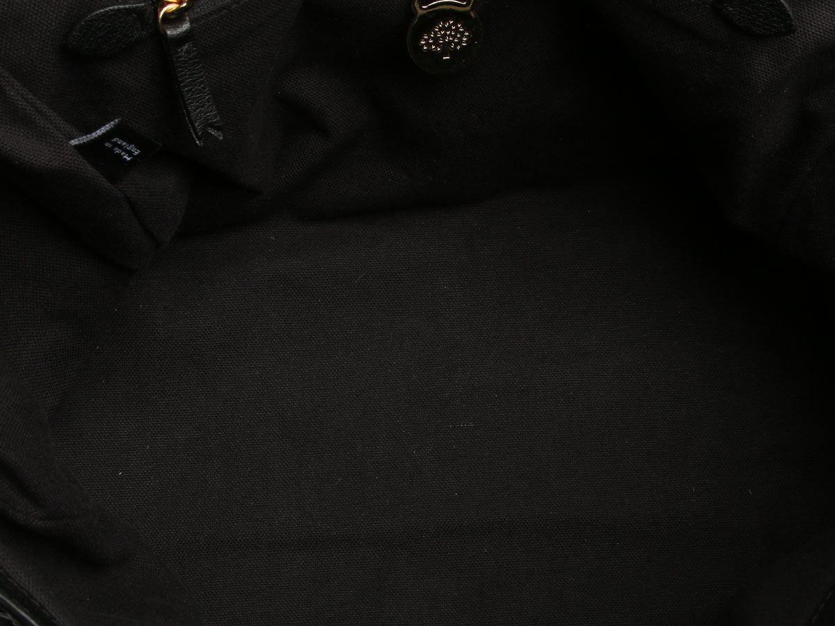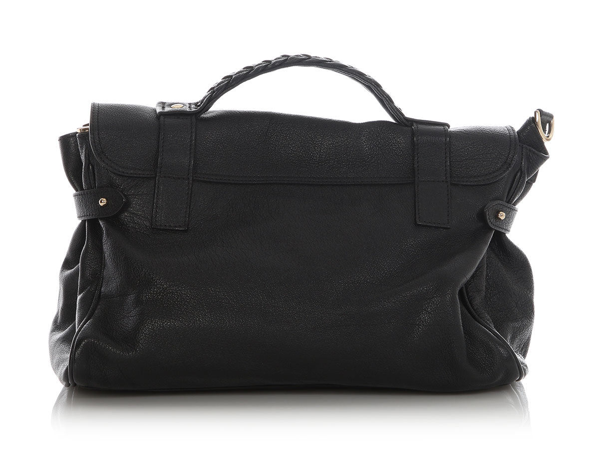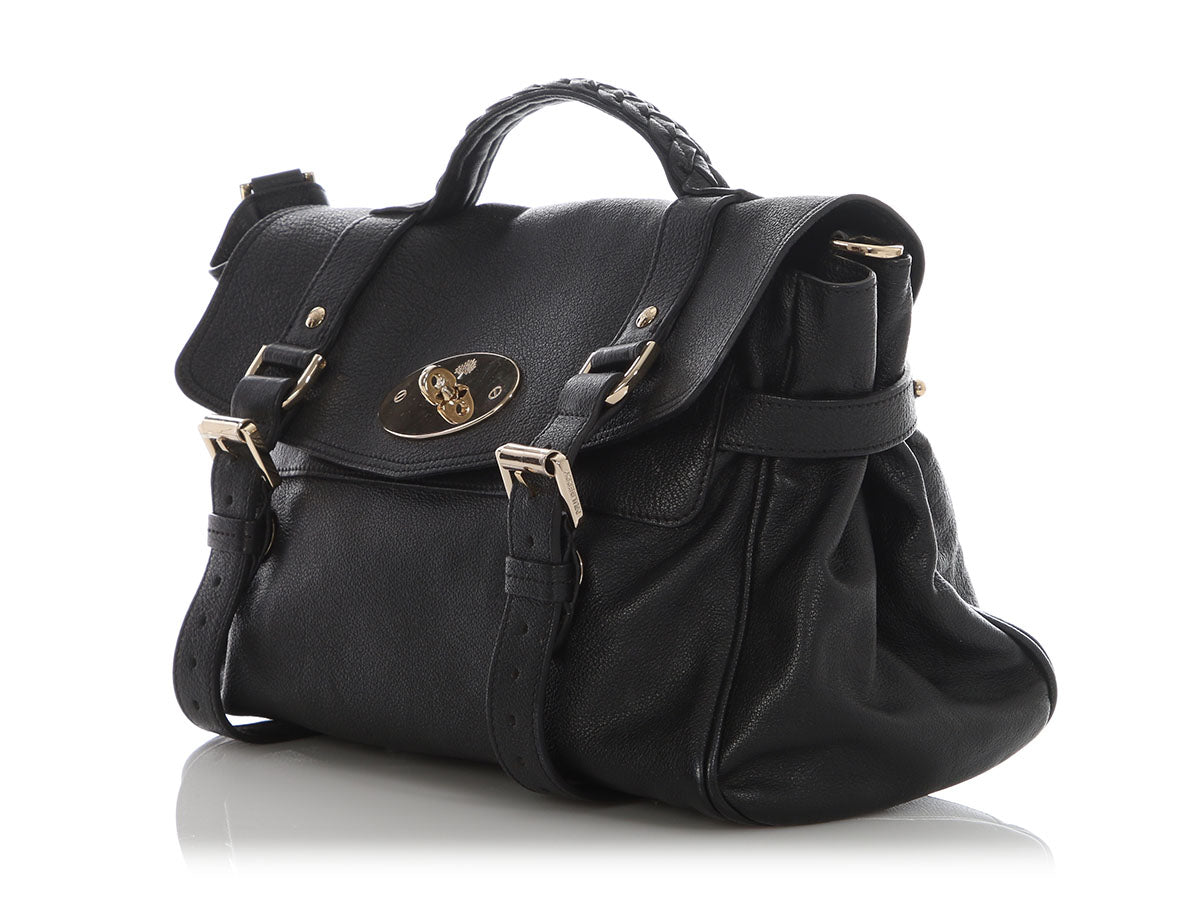 Mulberry’s Black Alexa is made of wonderfully slouchy, soft leather! The flap secures with a turn lock and two straps with magnetic snaps, opening to black suede and black fabric inside, as well as one zipped and one slide pocket. In great condition, the gold hardware has some scratches. The little top handle has a 1.25-inch drop, while the adjustable, detachable shoulder strap is shown with a 22-inch drop, giving this satchel some serious sway!