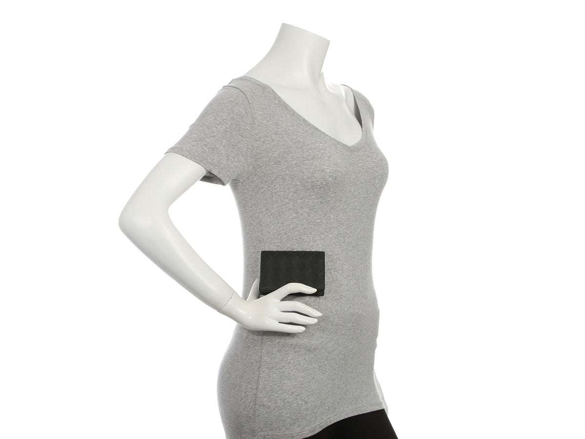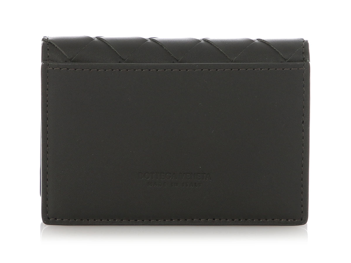 Functional and fabulous, this sleek little Bottega Veneta Black Intrecciato Business Card Case is all business! Made of matte black woven leather with a smooth leather back, this compact card holder flaps closed and features a front slide pocket beneath the flap, plus one more slide on the back. The pocketless interior is lined in smooth black leather. In excellent condition, it has light scratches throughout. This unisex piece is perfect for tossing into a pocket or purse and keeping your calling cards organized!