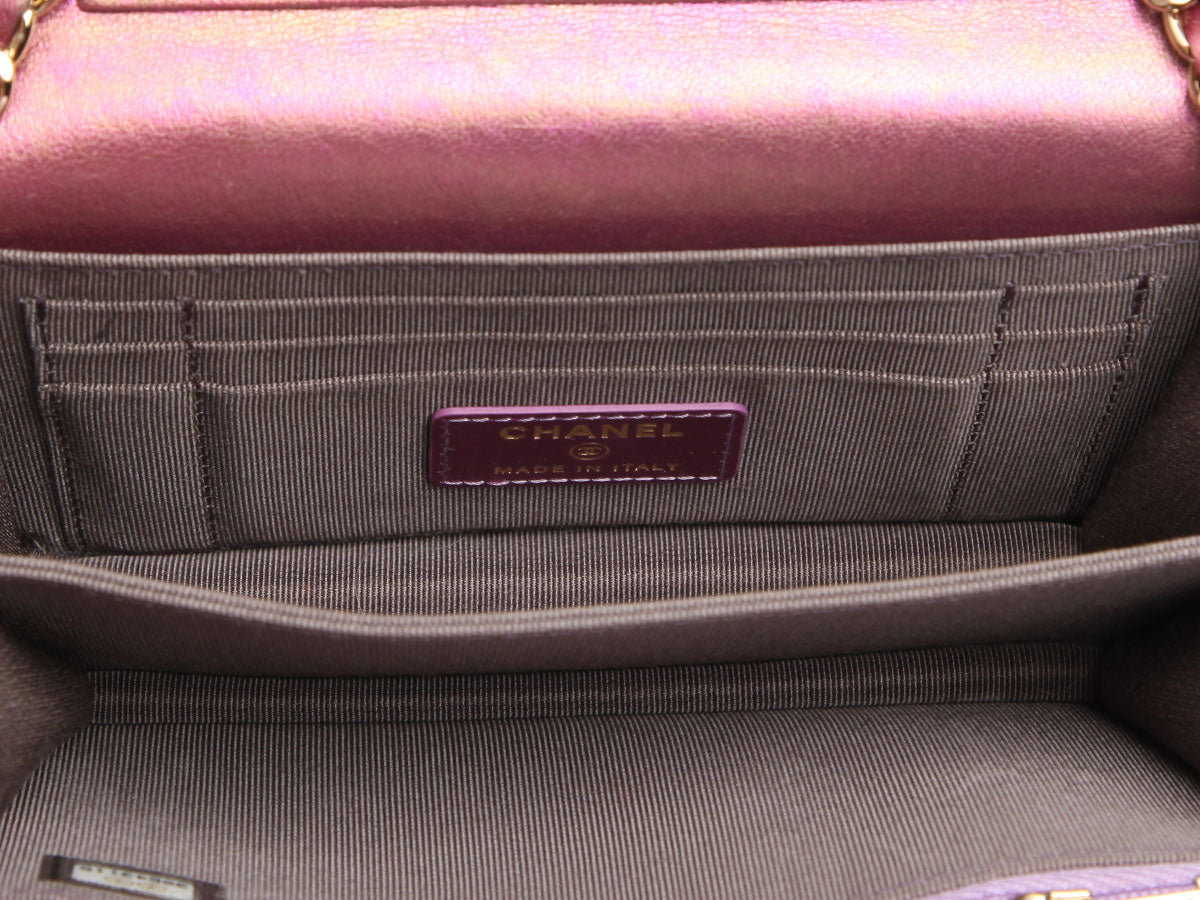 Chanel’s Mini Iridescent Pink Quilted Calfskin Wallet on Chain is a shimmering little stunner! Made of dazzling pink calf leather with shiny gold-tone hardware, this compact crossbody features a leather-threaded chain strap with a 23.5-inch drop and secures with a magnetic flap closure. There’s a zipped pocket on the back and more organized function within the gray fabric-lined interior than you'd expect—five card slots under the flap, a long zip pocket, two interior sections, and three additional card slots. In very good condition from 2020 with a dustbag and card, it has light wear inside, as well as wear on the corners, edges, and hardware. This piece adds a playful pop of color to any outing!