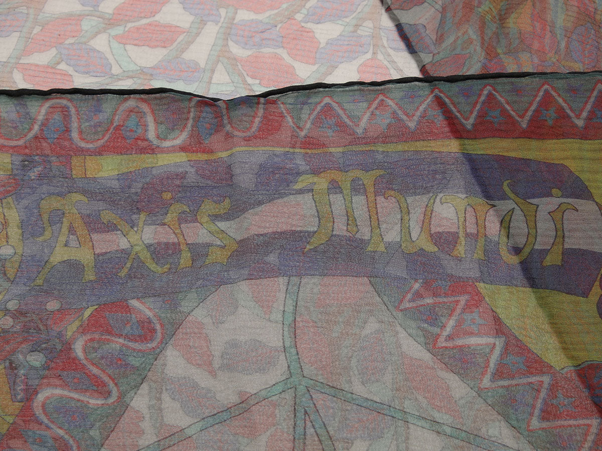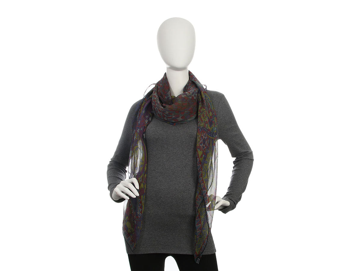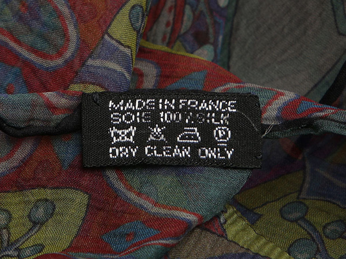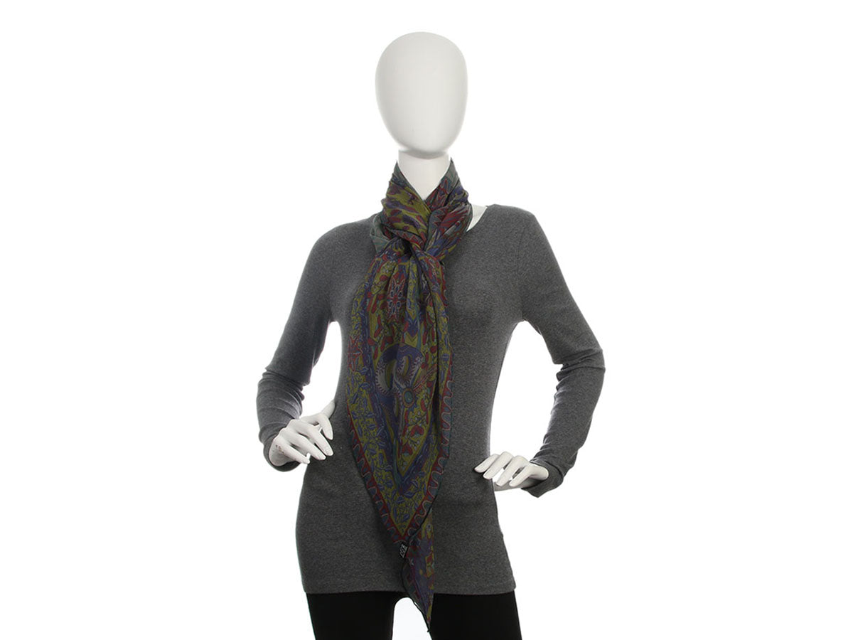 Christine Henry’s design on Hermès’ Axis Mundi Mousseline Shawl depicts the World Tree, which connects heaven to earth and connects you to a fabulous look! Made of a lightweight, sheer 100% silk in rich shades of blue, olive green, and purple, it features a tree in the center surrounded by birds, masks and a cornucopia. In excellent condition, it has a few faint pulls. It’s a gauzy year round scarf that looks—and feels—heavenly!