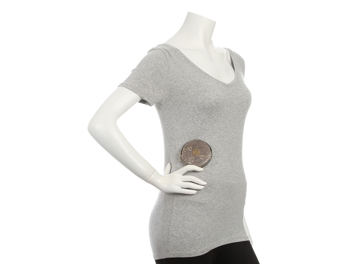 Loewe’s Round Lizard Coin Purse is a practical accent with an exotic look! Made of a gray lizard skin with an intricate gold Loewe Anagram logo on the front, it zips open to a black leather interior. In excellent condition, there are some scratches on the hardware. It’s useful for keeping organized and for flaunting your style!