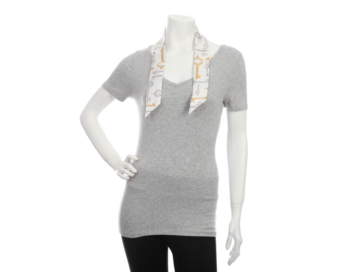 Unlock a lovely look with Tiffany & Co Keys Silk Twilly Scarf! Made of 100% silk in white, gray and gold, it features bejeweled keys in different sizes and shapes. New and never worn with a box, this is your key to fabulous fashion!