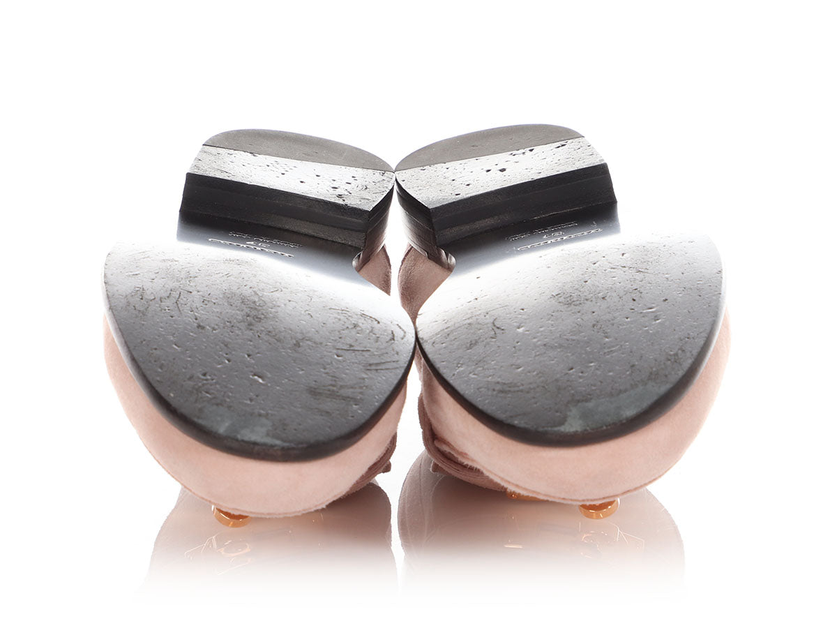 Hermès’ Pink Suede Destin Loafers are sassy and feminine! Made of light pink soft suede with black stacked 0.5-inch heels, leather inners, and leather soles, they have rose gold Kelly hardware over the tops. In very good condition with a box and two dustbags, they have wear on the soles, light stressing, and very faint scratches on the hardware. These are classic loafers in an eye-catching color!