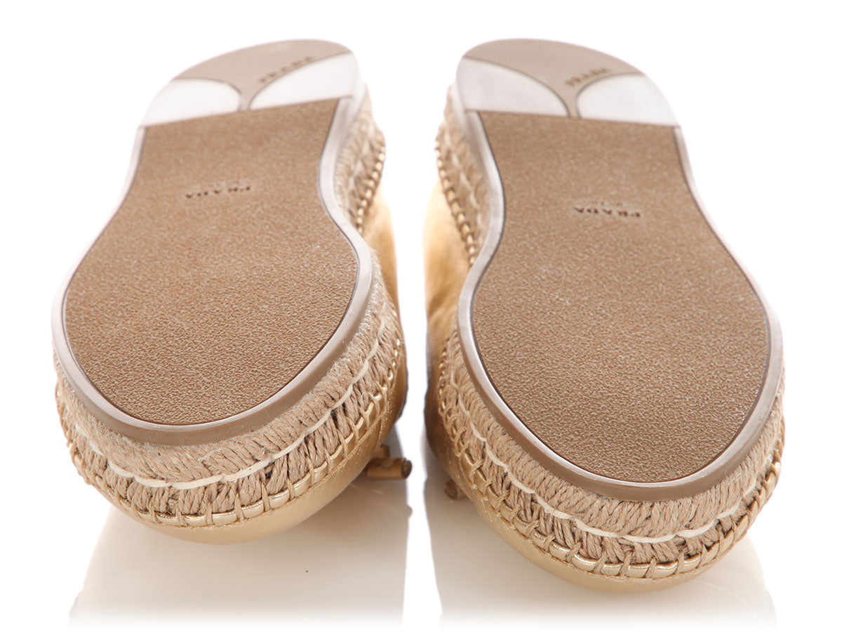 Prada’s Metallic Gold Leather Espadrilles add a warm glow to your summer wardrobe! These slip-on flats feature tonal leather bows and gold logo hardware over the vamps. The edges are wrapped in natural jute, while leather inners and rubber soles round out the design. New with two dustbags, they deliver effortless glamour that’s easy on your feet!