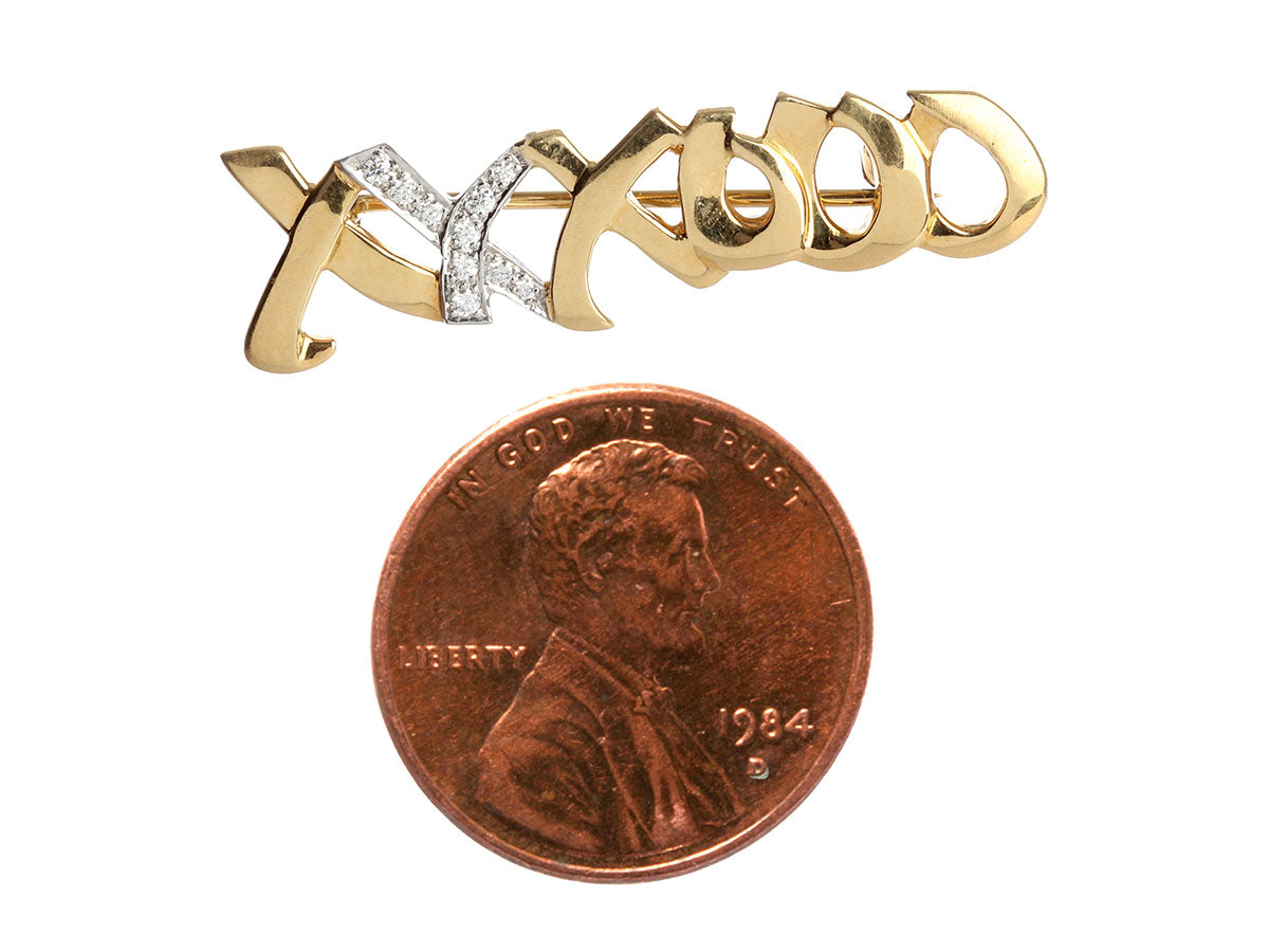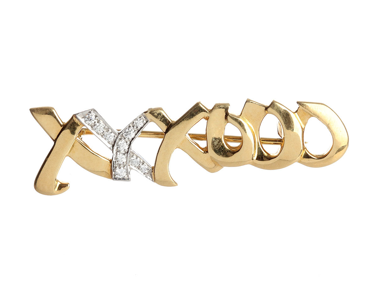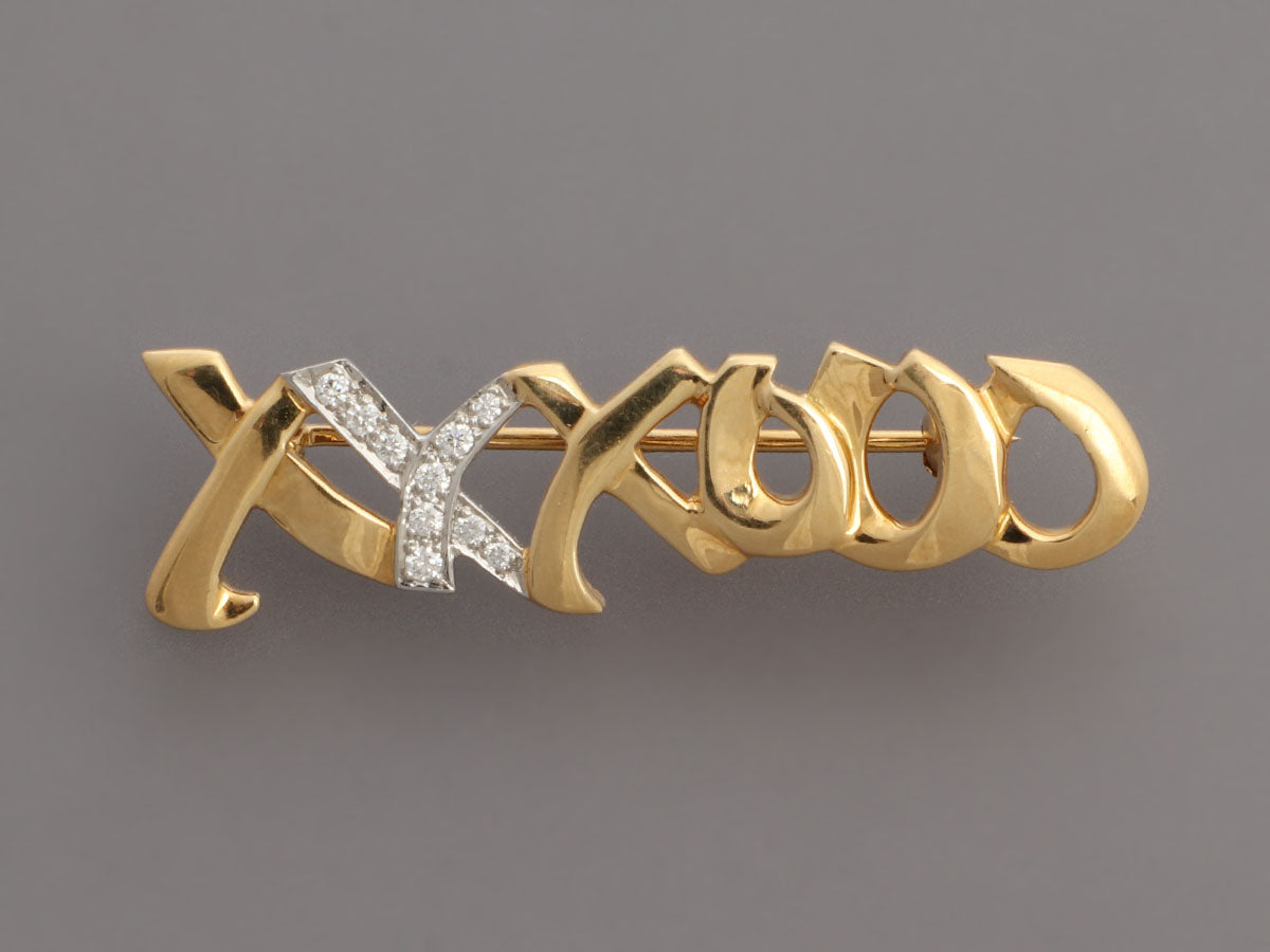 Tiffany & Co.’s Vintage Paloma Picasso Two-Tone Diamond Hugs and Kisses Pin lets you wear your heart on your lapel, hat, bag, or even your sleeve! The pin is crafted of 18k yellow gold and the 0.15 carat of white diamonds are prong set in platinum. In very good condition, it comes with a pouch and has some scratches on the metal. Wear this pin all day, everyday and practice a little positive affirmation!