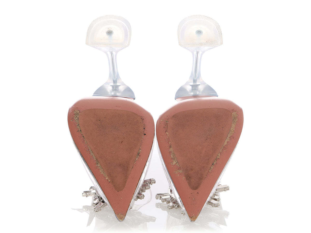 Amina Muaddi’s Clear Crystal Begum Slingback Pumps serve up Cinderella vibes with a modern, see-through twist! Crafted from transparent PVC that showcases the foot, they’re topped with crystal sunburst brooches and set on 3.75-inch sculptural flared heels for a dramatic lift. The pointed toes keep the silhouette sleek, while leather insoles and soles finish the luxe look. In good condition, they have wear on the soles and inners as well as surface scratches to the PVC that would benefit from a gentle clean. Slip them on to sparkle your way through evening events or elevate daytime denim with a flash of fairy-tale chic!
