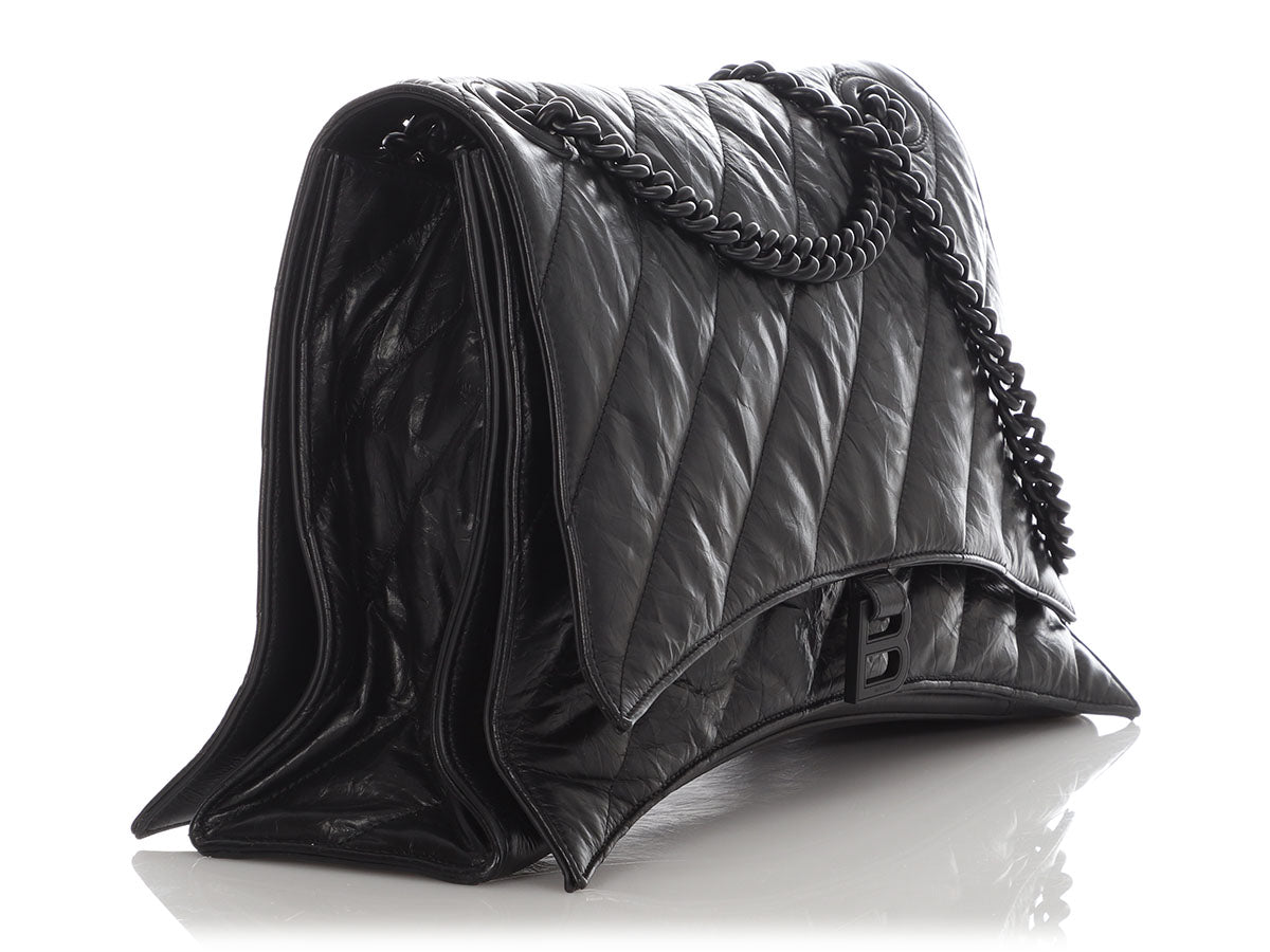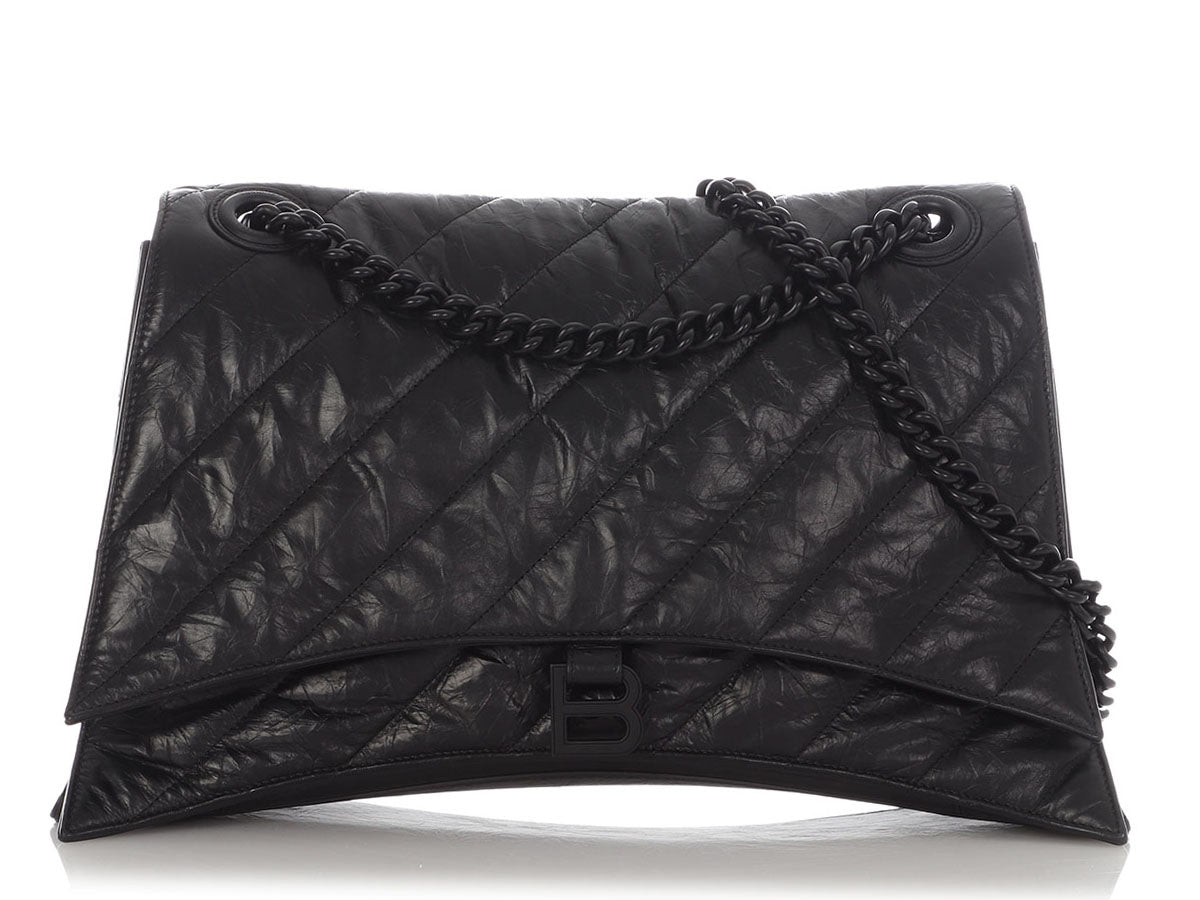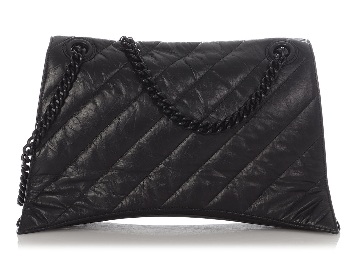 Even if you’re not looking for love, you’re going to have the biggest crush on Balenciaga’s SO Black Crush Large Chain Shoulder Bag! It's made of black crinkle textured leather, while the strap is blackened chain with a drop of 9.75 inches or 18 inches when pulled through. A magnetic snap secures the flap, opening to black leather inside divided into two sections, with a large slide pocket running down the center, as well as a zipped and another slide pocket. In very good condition with a dustbag, there is light rubbing at the corners, some scratches on the hardware, a few light scratches on the leather, and the back has some creasing and one corner is bent out of place. It’s a large bag with lots of room, and you’ll be SO infatuated with it!