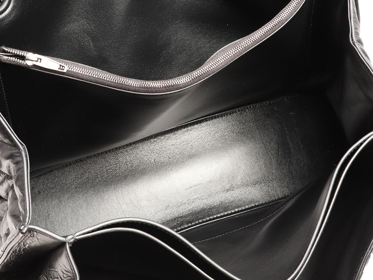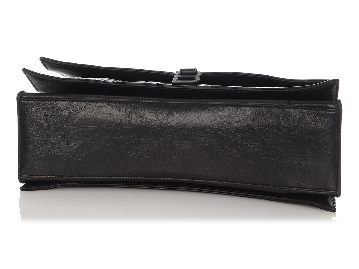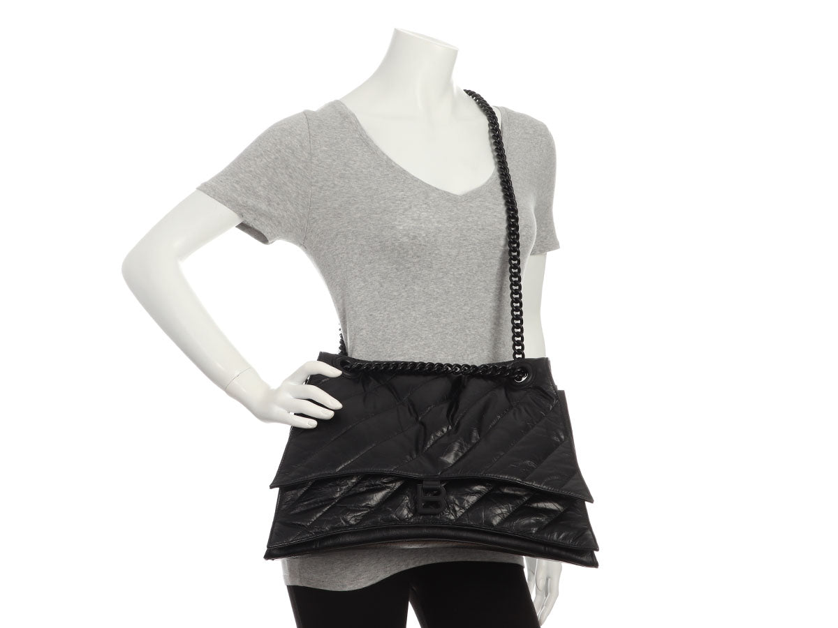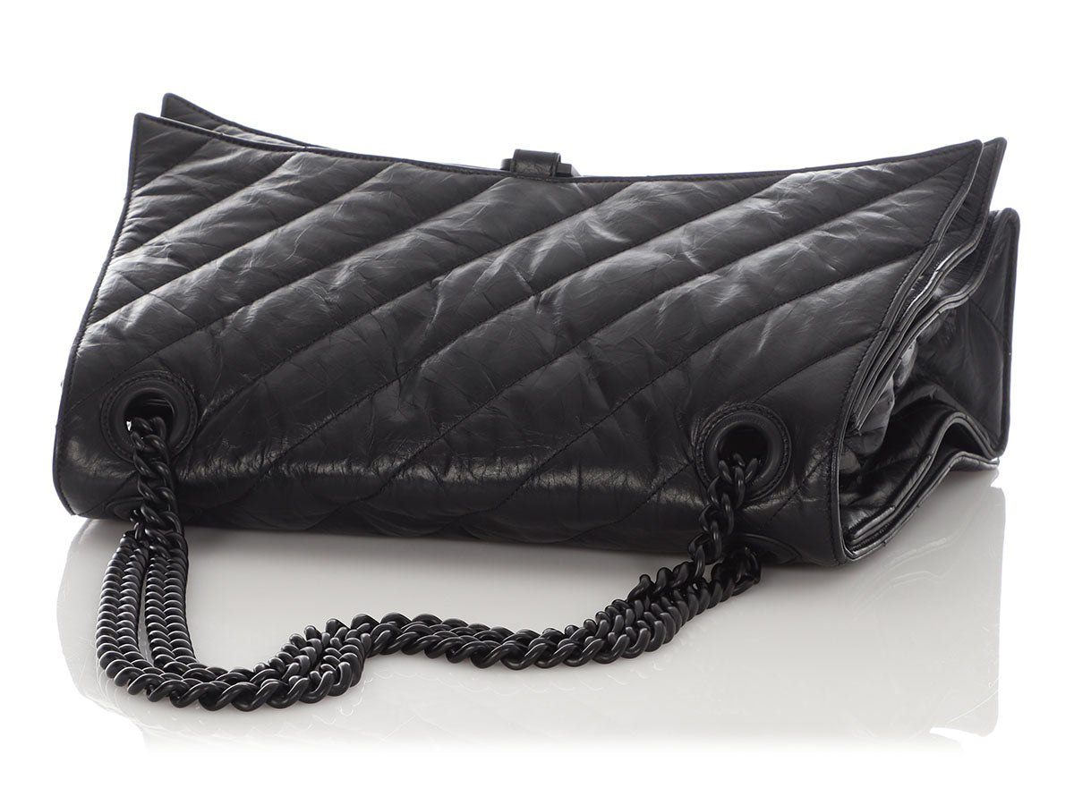 Even if you’re not looking for love, you’re going to have the biggest crush on Balenciaga’s SO Black Crush Large Chain Shoulder Bag! It's made of black crinkle textured leather, while the strap is blackened chain with a drop of 9.75 inches or 18 inches when pulled through. A magnetic snap secures the flap, opening to black leather inside divided into two sections, with a large slide pocket running down the center, as well as a zipped and another slide pocket. In very good condition with a dustbag, there is light rubbing at the corners, some scratches on the hardware, a few light scratches on the leather, and the back has some creasing and one corner is bent out of place. It’s a large bag with lots of room, and you’ll be SO infatuated with it!