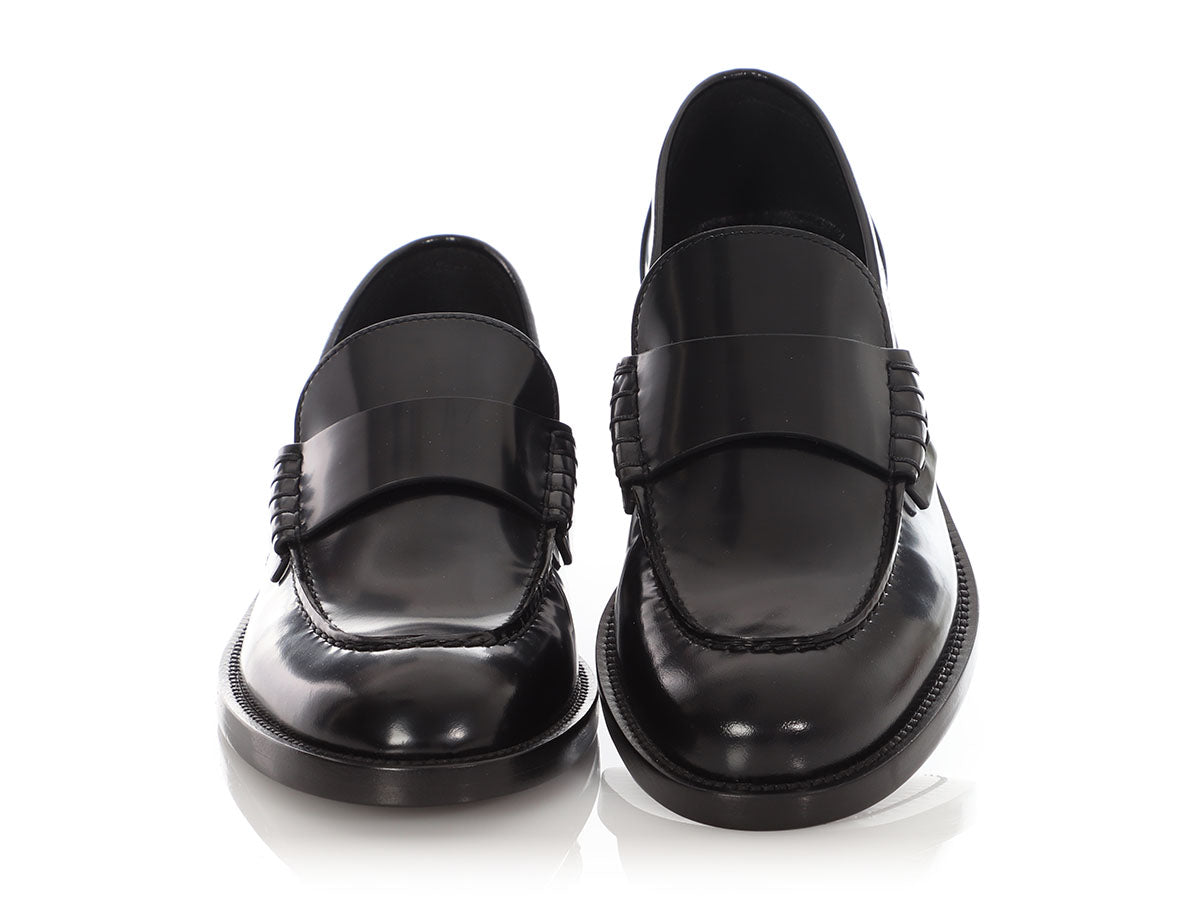 Chanel’s Black Shiny Calfskin Loafers are sleek and sophisticated! They're made of glossy black calf leather with the Chanel name in gold hardware above the black stacked 0.5-inch heels. New and never worn with a box, two dustbags, and info booklet, these slip-ons have leather inners, leather soles, and a classic style!