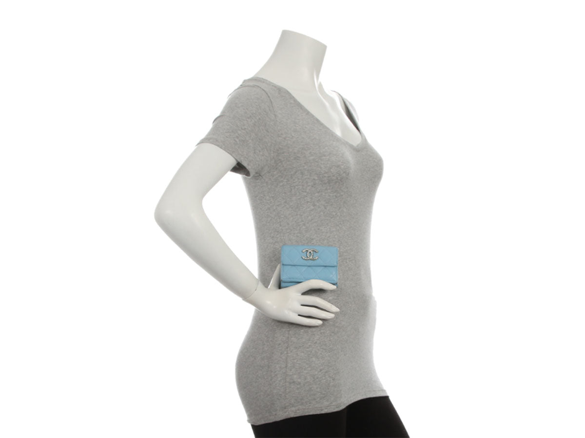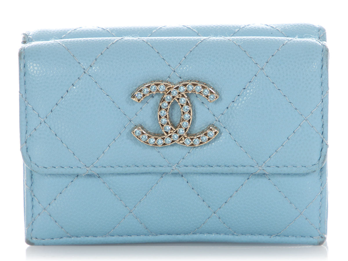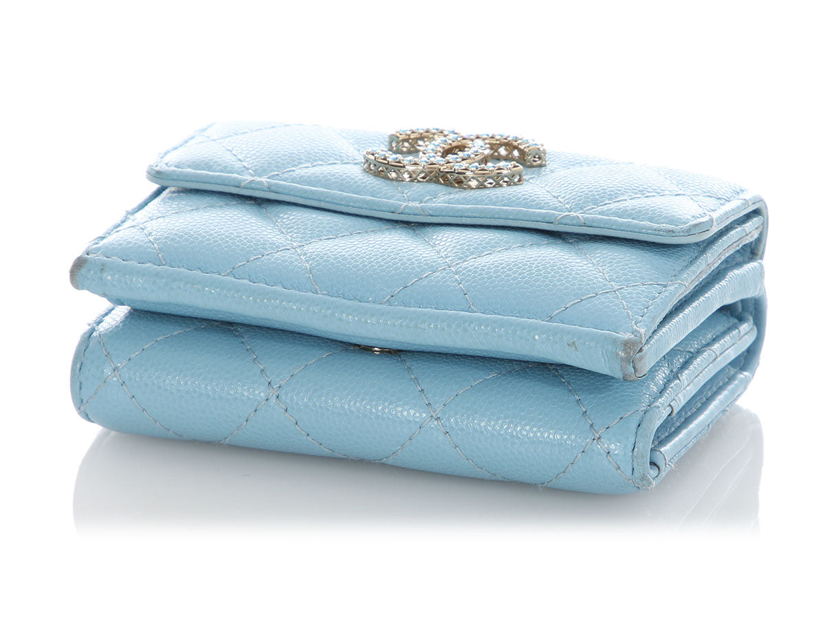A sparkling little essential, this Chanel Blue Quilted Caviar Crystal Logo Compact Wallet brings luxury into your every day! Made of diamond-quilted baby blue leather with gold hardware, it features a snapped flap pocket adorned with a crystal-studded CC on the front. This trifold then unsnaps to reveal a tonal leather-lined interior with a long slide for bills and six card slots. In good condition, it has wear on the corners, edges, and inside. This petite piece packs a lot of glam into a small package!