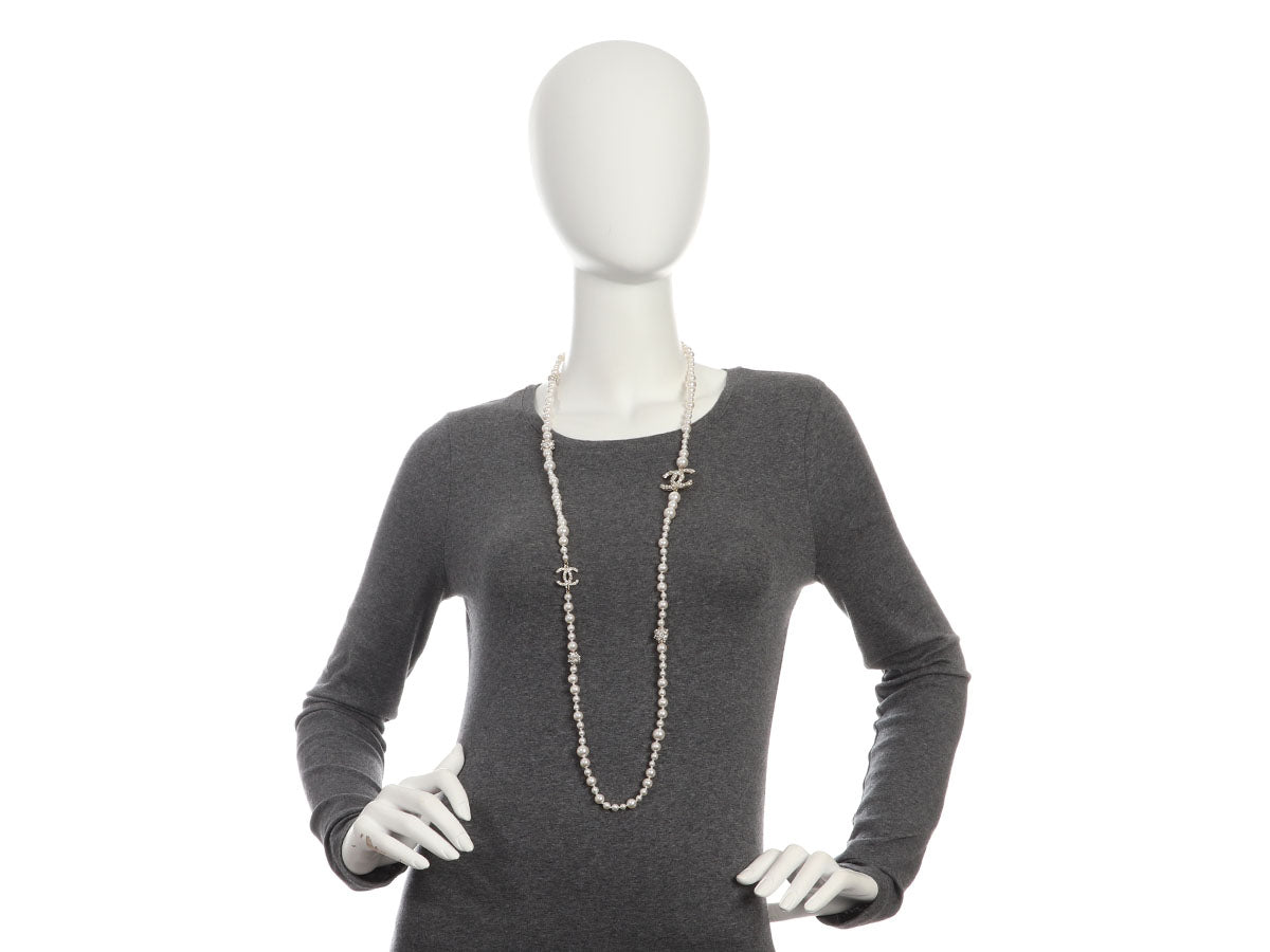 Chanel’s Long Pearl and Crystal Logo Necklace has two pearl-and-crystal logo stations and four pearl-and-crystal ball stations! The strand of variously sized pearls secures with a lobster clasp with a logo charm hanging nearby. New and never worn, it comes with a pouch and box. Wear this necklace long or wrap it twice for the ever-popular layered look!
