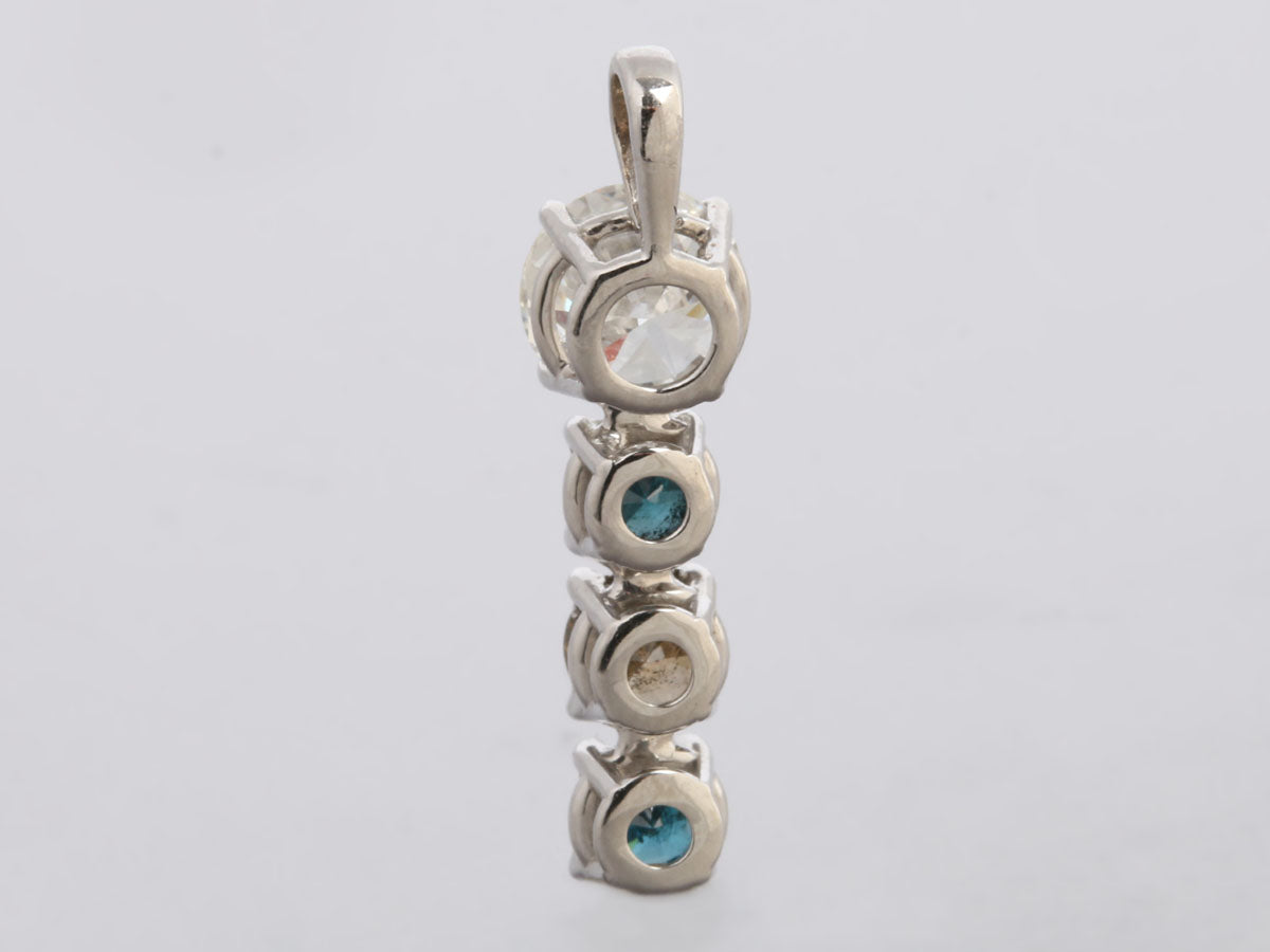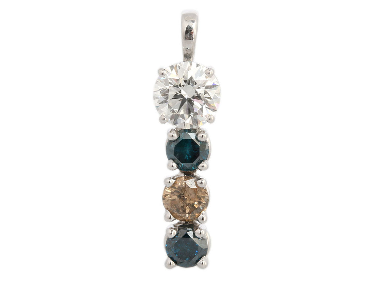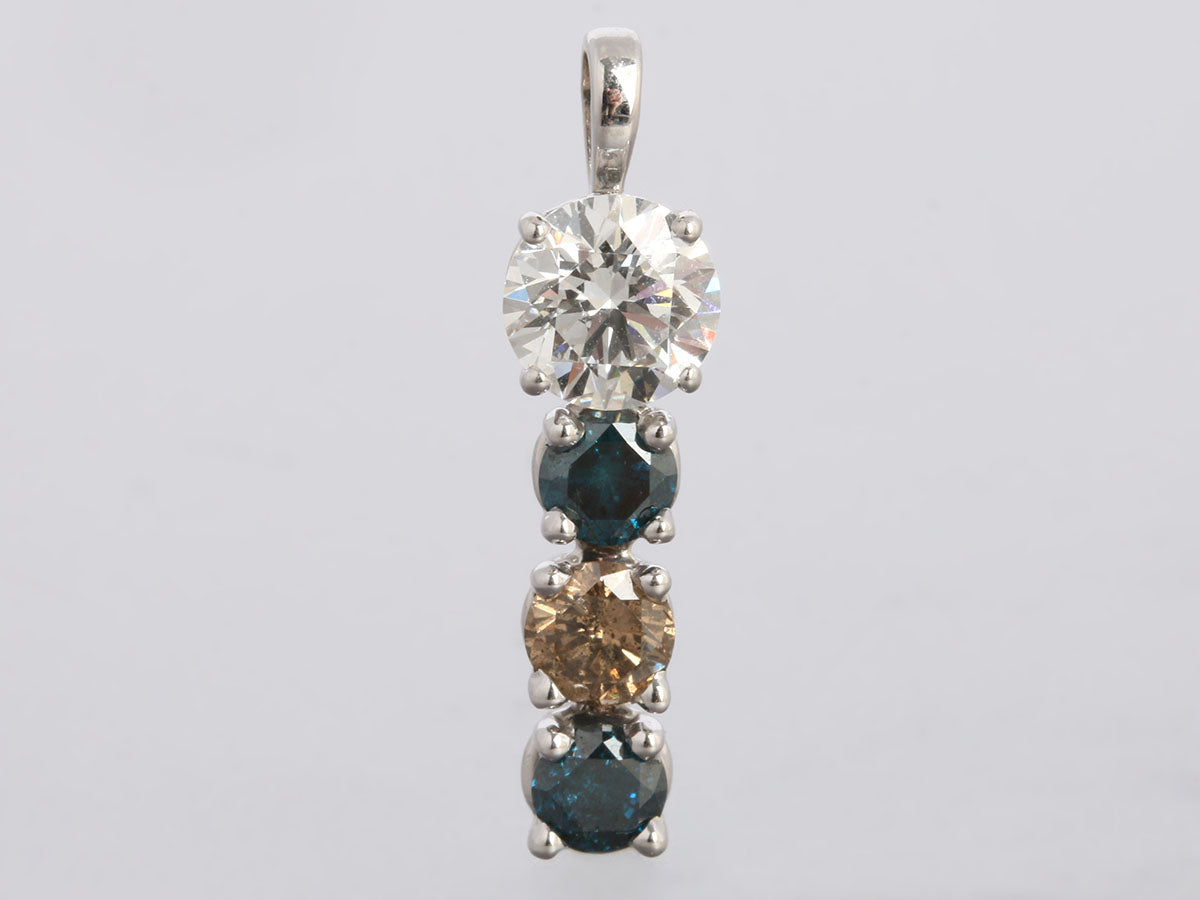 This custom-made 14K White Gold Four-Stone Diamond Pendant shines with a unique mix of natural and lab-grown stones! This quartet features a total diamond weight of 1.36 carats—at the top is a 0.78-carat lab-grown diamond of E color and VVS2 clarity, followed by two natural color-treated blue diamonds totaling 0.36 carats and one natural cognac diamond of 0.22 carats. The bail accommodates a 3-millimeter chain. In excellent condition, it may have been worn and offers a striking combo of modern craftsmanship and colorful sparkle!
