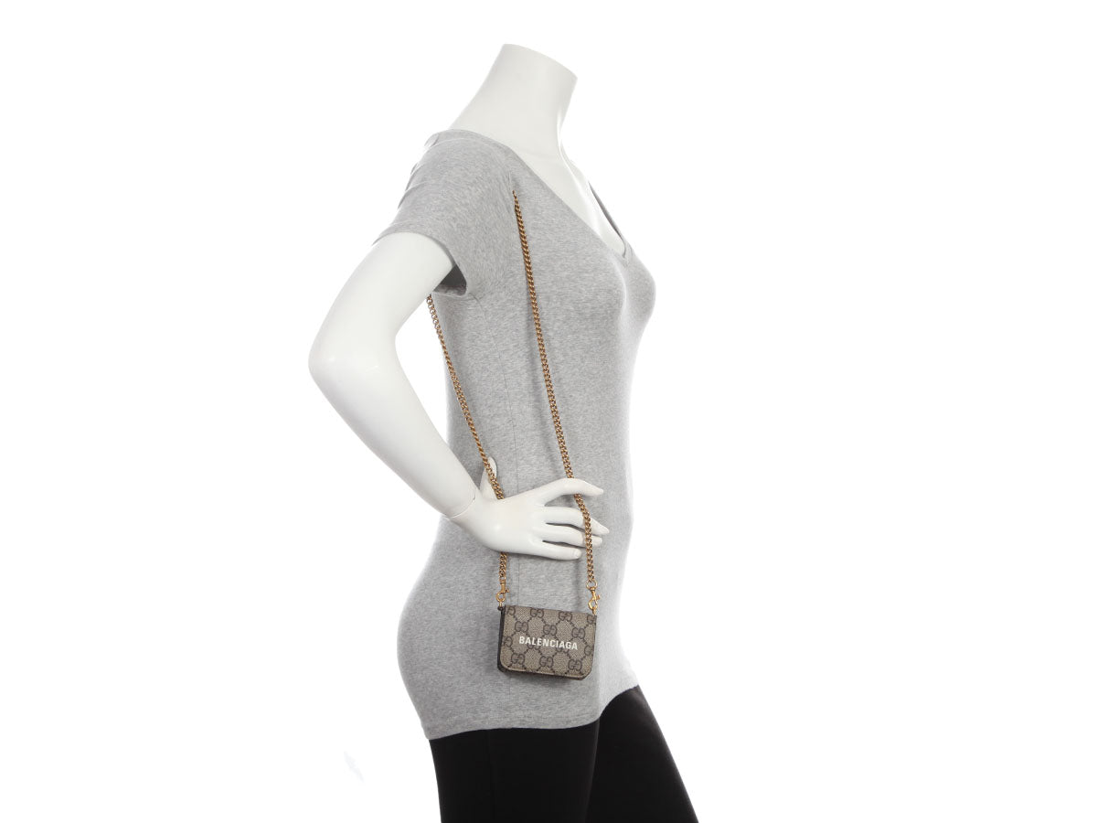Two classic styles come together on Gucci x Balenciaga’s Mini Hacker Project Monogram Cash Wallet on Chain. Made of brown GG Supreme canvas for supreme Gucci style, the front sports a bold white "Balenciaga" as well. A flap pocket on the front snaps to secure, while a fold opens the top, opening to matching canvas inside with a billfold and three slide pockets. New and never worn with a box, dustbag, and info booklets, the detachable antiqued gold chain strap lets you carry this petite collaboration hands-free!
