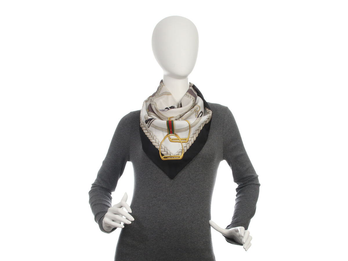 This Gucci Equestrian Print Scarf is perfect for a day at the races! Made of 100% silk twill in black, white, and taupe, it features jockey helmets and stirrups at each corner with a horse’s head in the center. In great condition with a box, it has a stain near the horse’s nose and a few tiny pulls. The house’s horse-loving heritage has never looked finer!