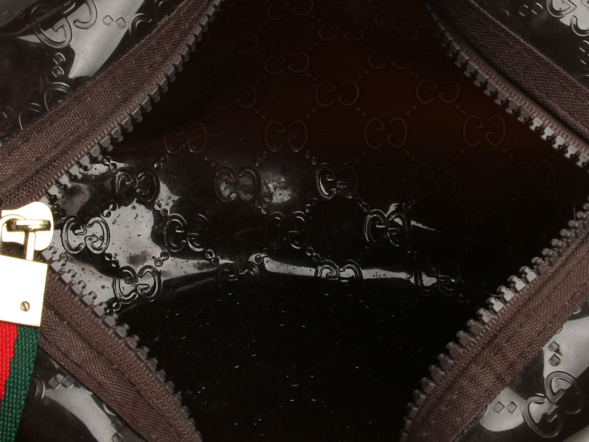 Gucci’s Brown Parfums Cosmetic Case keeps your beauty essentials organized on the go! Made of dark brown monogram PVC, it’s accented with a Gucci Parfums patch on the side and gold logo hardware. The top unzips with a green-and-red webbing pull to reveal a pocketless, unlined interior. In good condition, it has smudges and marks throughout, wear on the corners and edges, scratches on the hardware, a slight perfume smell, and it would benefit from a cleaning. This practical pouch is perfect for all your out-of-town adventures!