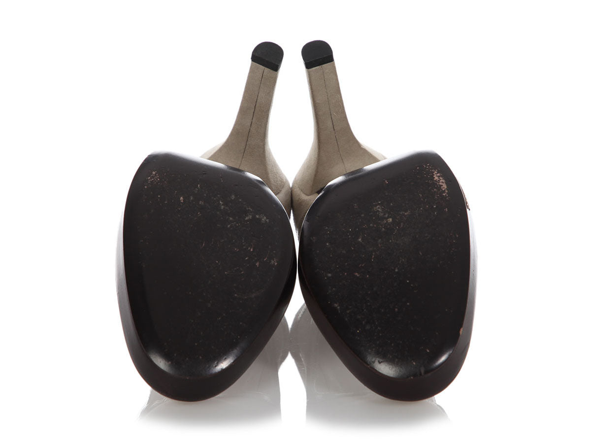 Gucci’s Pale Peat Suede Pumps have a sophisticated style with cute silver buckle details! Made of light gray suede, they have brown stacked edges and 4-inch heels. In very good condition with a box, two dustbags, and info cards, they have a few scratches, some tiny dark marks, scratches on the sides, and wear on the soles. They’re a nice neutral tone to dress up or down!