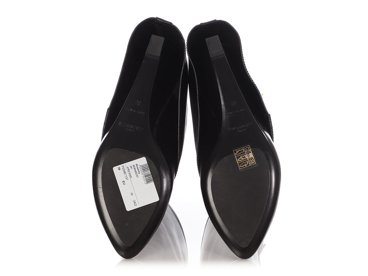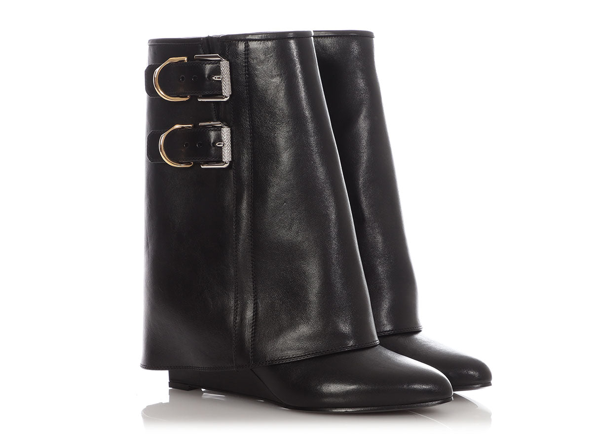 Givenchy’s Black Shark Lock Buckled Ankle Boots have some seriously cool style! Made of thick black leather with 2.25-inch wedge heels and rounded toes, they slip on and buckle with two sets of adjustable gold and silver buckles. In excellent condition with a dustbag, they’ve never been worn but have a few scratches. With leather inners and soles, they’re fun and funky!