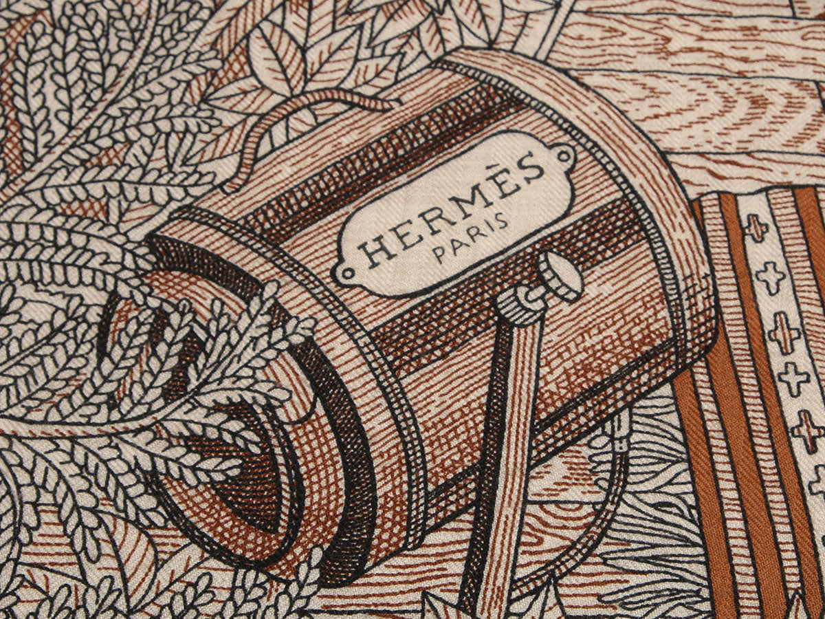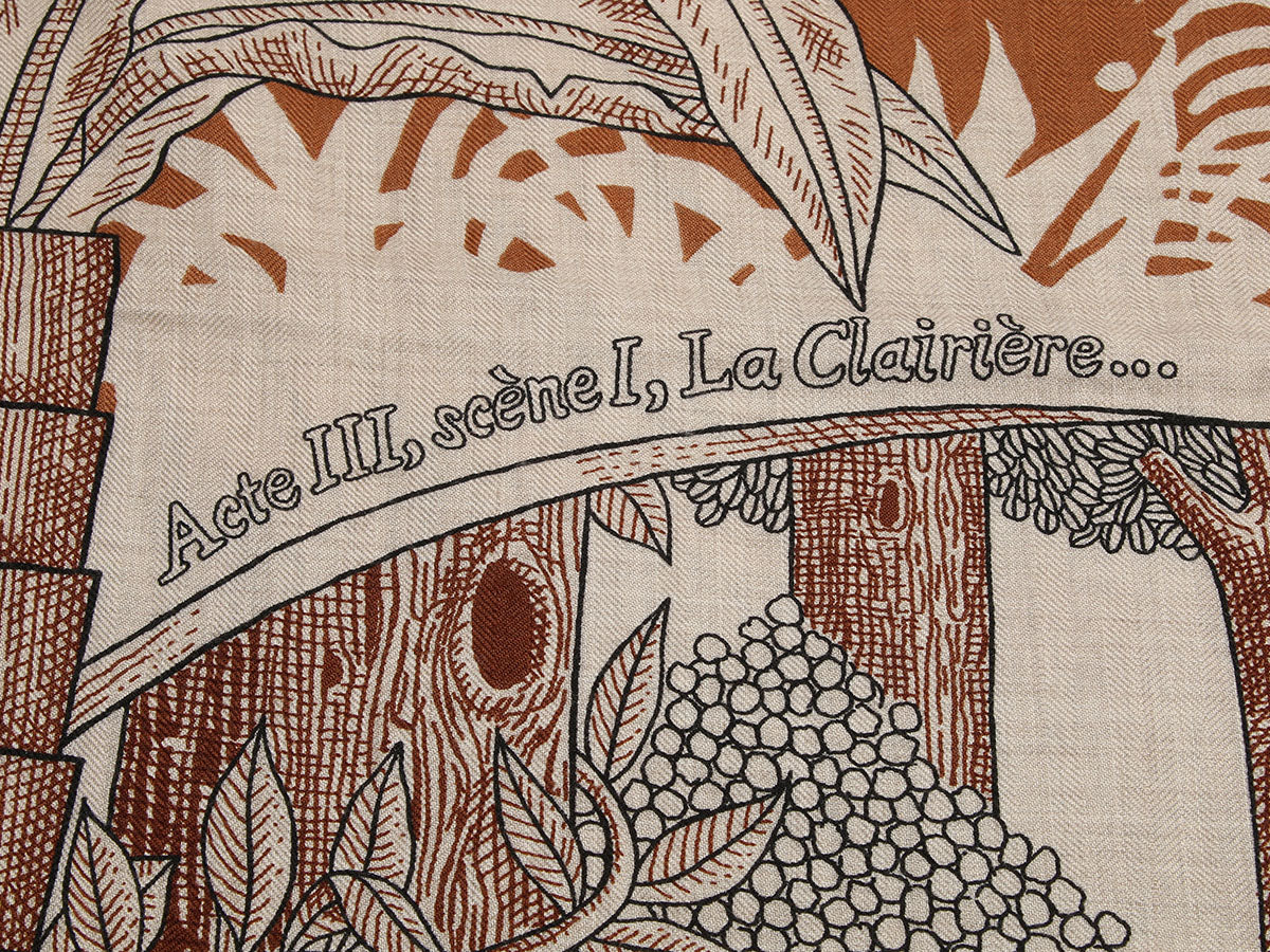Hermès’ Acte III, Scene I, La Clairière Shawl conjures a dreamlike tableau from Shakespeare’s A Midsummer Night’s Dream in warm tones of orange, brown, and natural! Woven from a cozy blend of 70% cashmere and 30% silk blend, this Edouard Baribeaud design drapes beautifully as a wrap or oversized scarf. In excellent condition, it has some light pilling. It’s a lovely choice for a night at the theater or an afternoon curled up with a book!