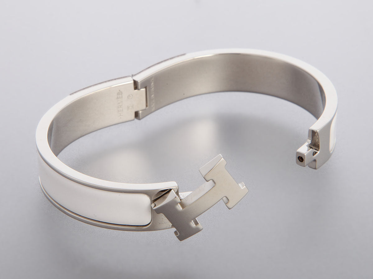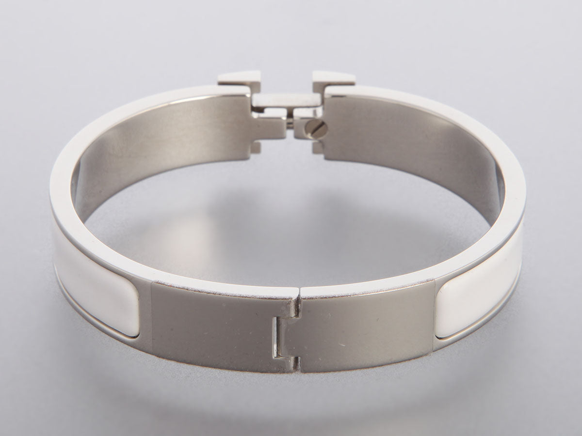 Hermès’ Narrow White Enamel Clic-Clac Bracelet is a crisp accent with timeless appeal! Featuring white enamel bordered by palladium hardware, this hinged design opens with a swivel H clasp and measures 11.5 millimeters wide. In excellent condition with a pouch and box, it still has some protective plastic in place. Whether stacked or worn solo, it brings an elegant polish to your wrist!
