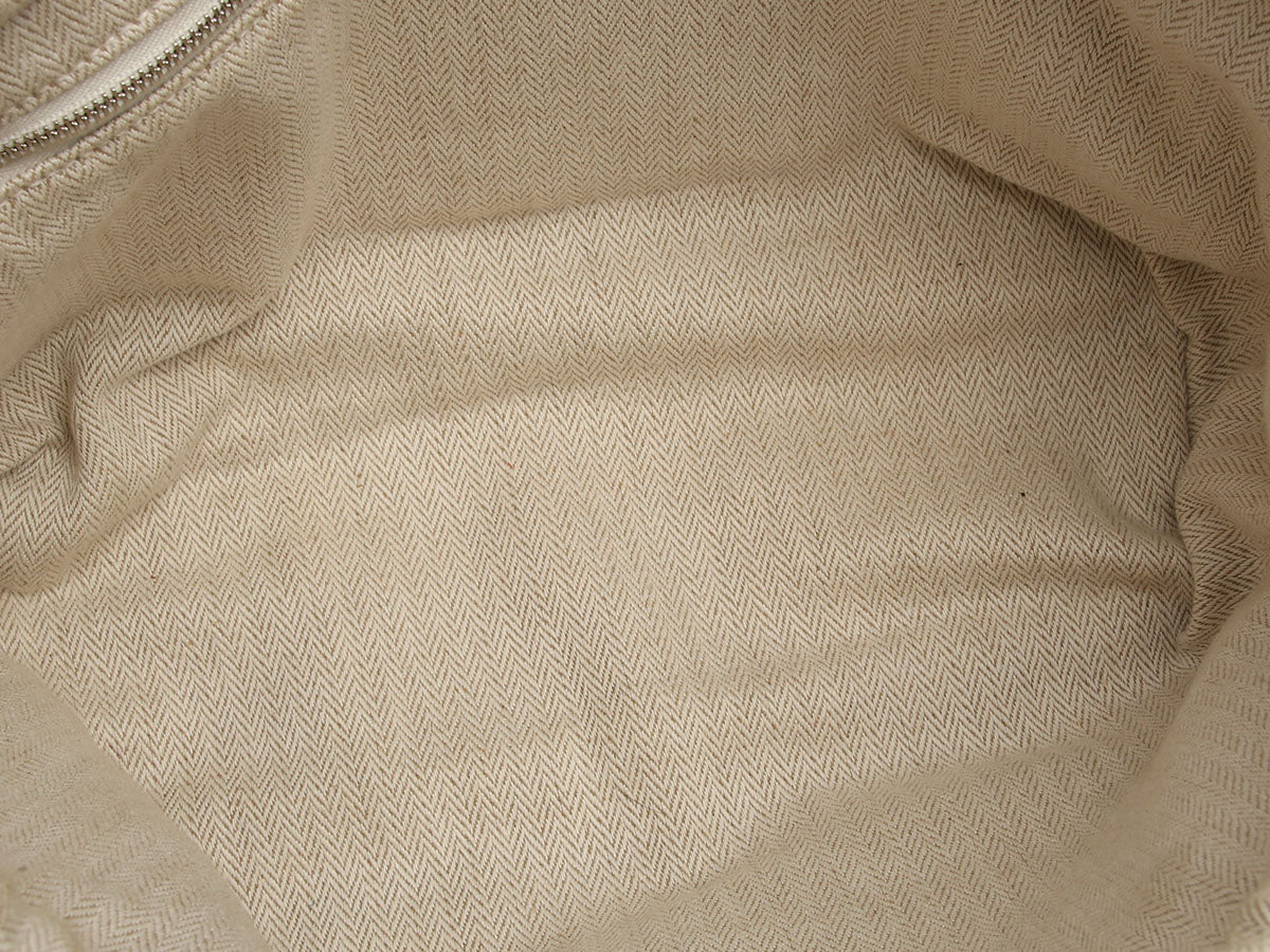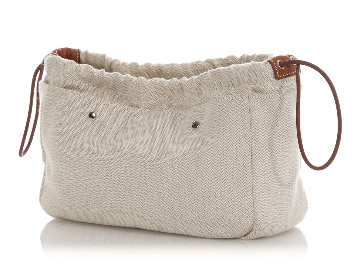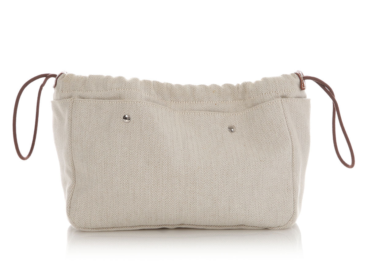 Hermès’ Natural Canvas and Fauve Barenia Fourbi Insert MM instantly turns any roomy tote into an organized haven! Crafted from durable toile chevron fabric with smooth brown Barenia leather trim, it features palladium snaps that let you cinch the ends for a slimmer profile, plus four exterior snap pockets to corral sunglasses, keys, and tech. A softly structured interior keeps larger items upright, while the neutral tan hue pairs effortlessly with almost any bag lining. In very good condition, it has wear on the hardware and inside. This handy insert is ready to bring order (and a touch of Hermès luxe) to your daily carry!
