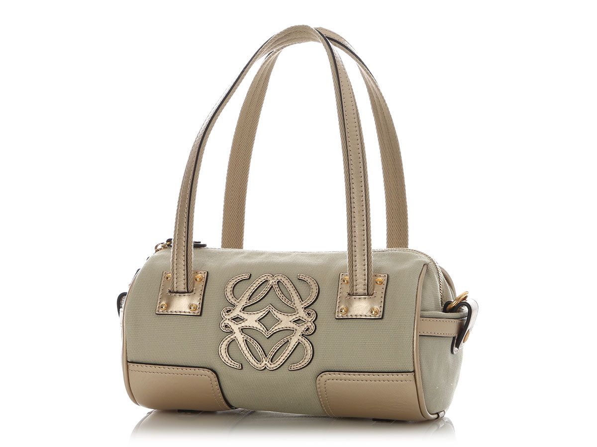 Loewe’s Gold and Beige Canvas Bolso Duffle Bag is a practical bag for day-to-day life! Made of beige canvas with gold metallic leather details and trim, it has slide pockets on the side. A double zipper opens the top to brown fabric lining with one zipped pocket inside. In great condition with a box, dustbag and info booklet, there are a few scratches on the leather and light scratches on the gold hardware. With a 7.75-inch drop to the handles, D-rings on the side let you add a strap for a grab and go look!
