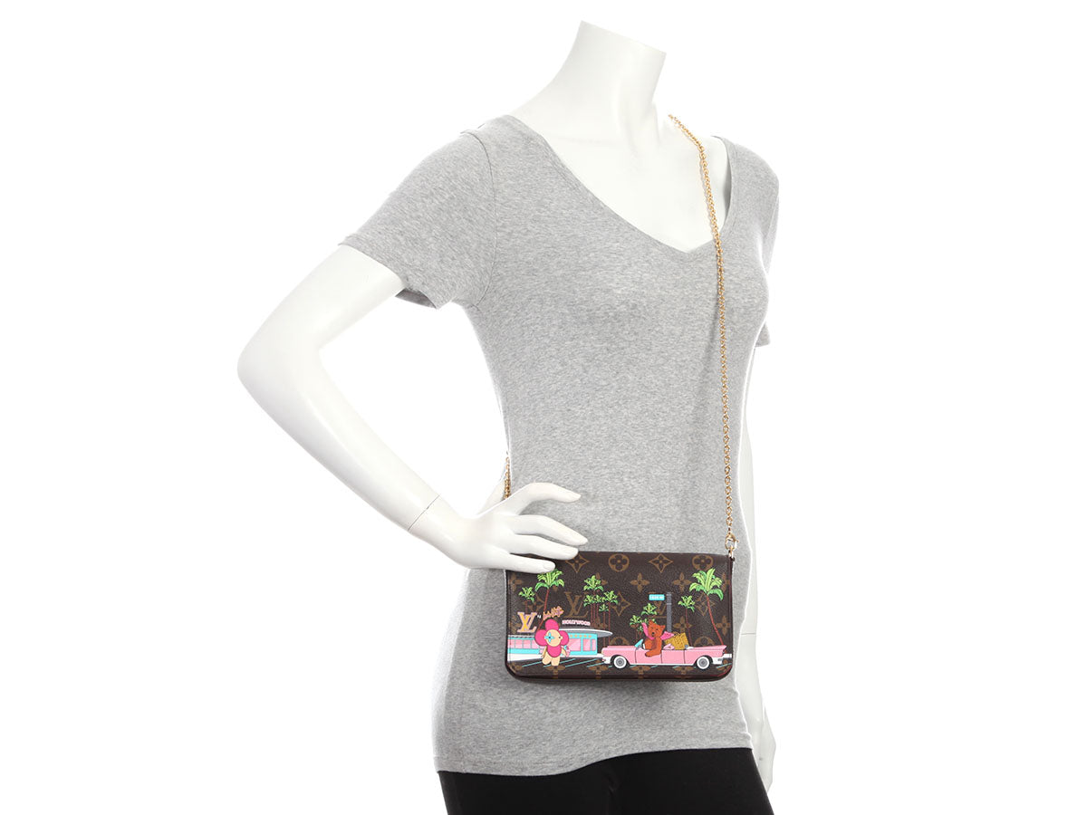 A limited edition from 2021, Louis Vuitton’s Monogram Christmas Animation Hollywood Félicie Pochette takes you on a cruise through Tinseltown! Made of brown coated canvas, it features a print starring Vivienne walking, drink in hand, while a bear drives by in a pink convertible. A snap secures the flap, opening to pink fabric inside with one slide pocket and two removable zipped inserts—one made of pink grained leather with eight card slots and a center slide pocket, the other made of monogram canvas with a zipped top. New with a dustbag, box, and detachable gold chain strap with a 22-inch drop, it’s a real cutie whether you carry it as a clutch or crossbody!