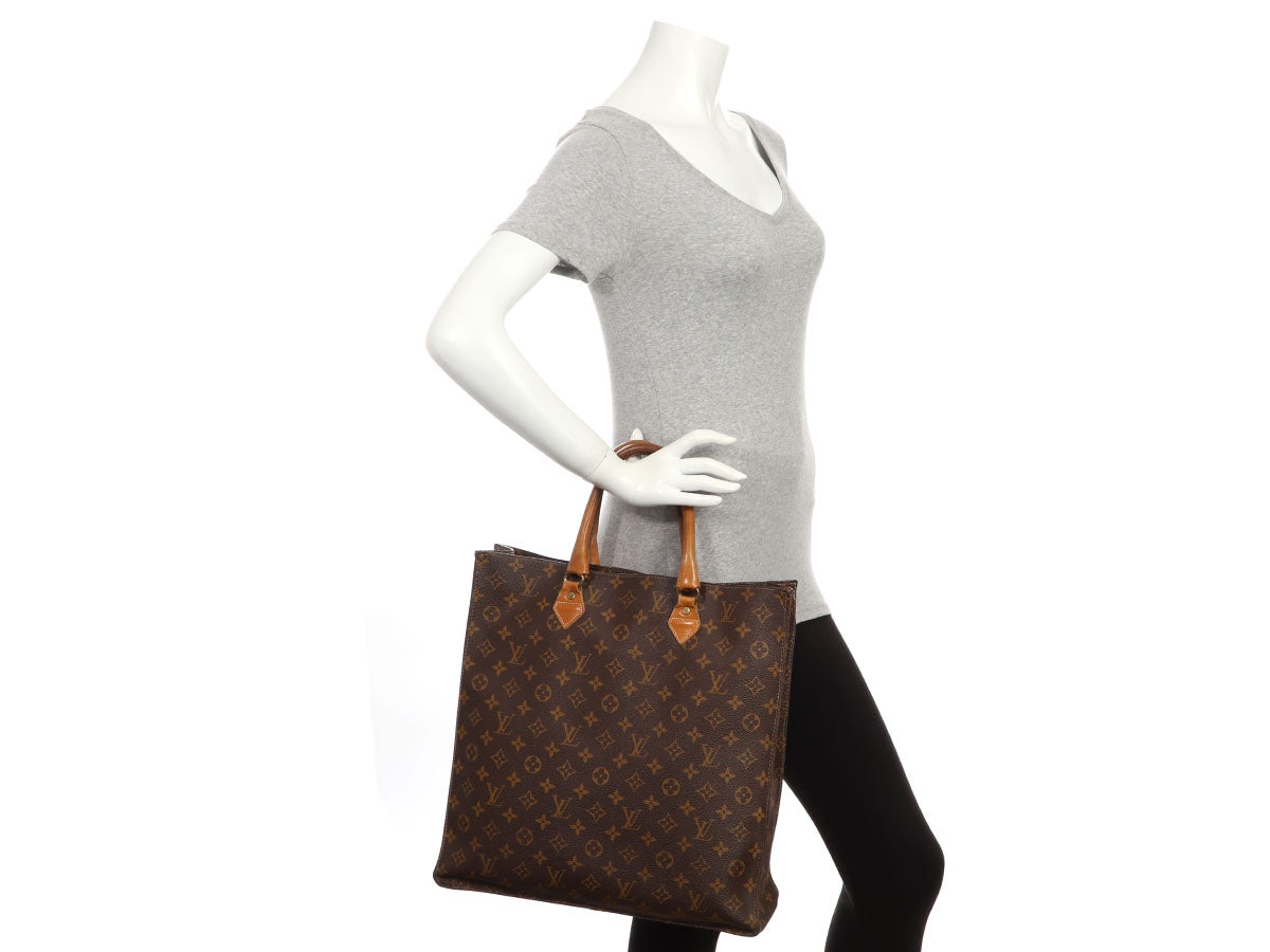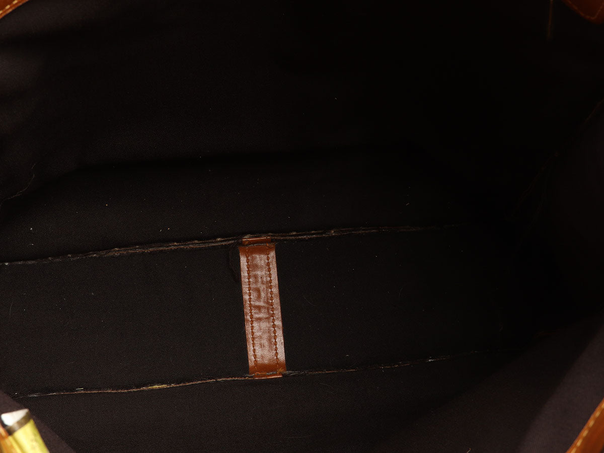 Louis Vuitton’s Vintage Monogram French Company Sac Plat gives new meaning to the term “shopping bag”! Made of lightweight brown monogram canvas, it’s paired with Vachetta leather in the trim and dual rolled-leather handles with a 5-inch drop and brass hardware. It has an open top that leads to brown-fabric lining with one zipped pocket inside. In fair condition, it has wear on the leather, handles, corners, edges, and inside, and is a bit perfume-y. The monogram is in good condition but the bottom of the bag and handles have the most wear. The tag inside says, “Manufactured in the U.S.A. under special license to the French Co.”!