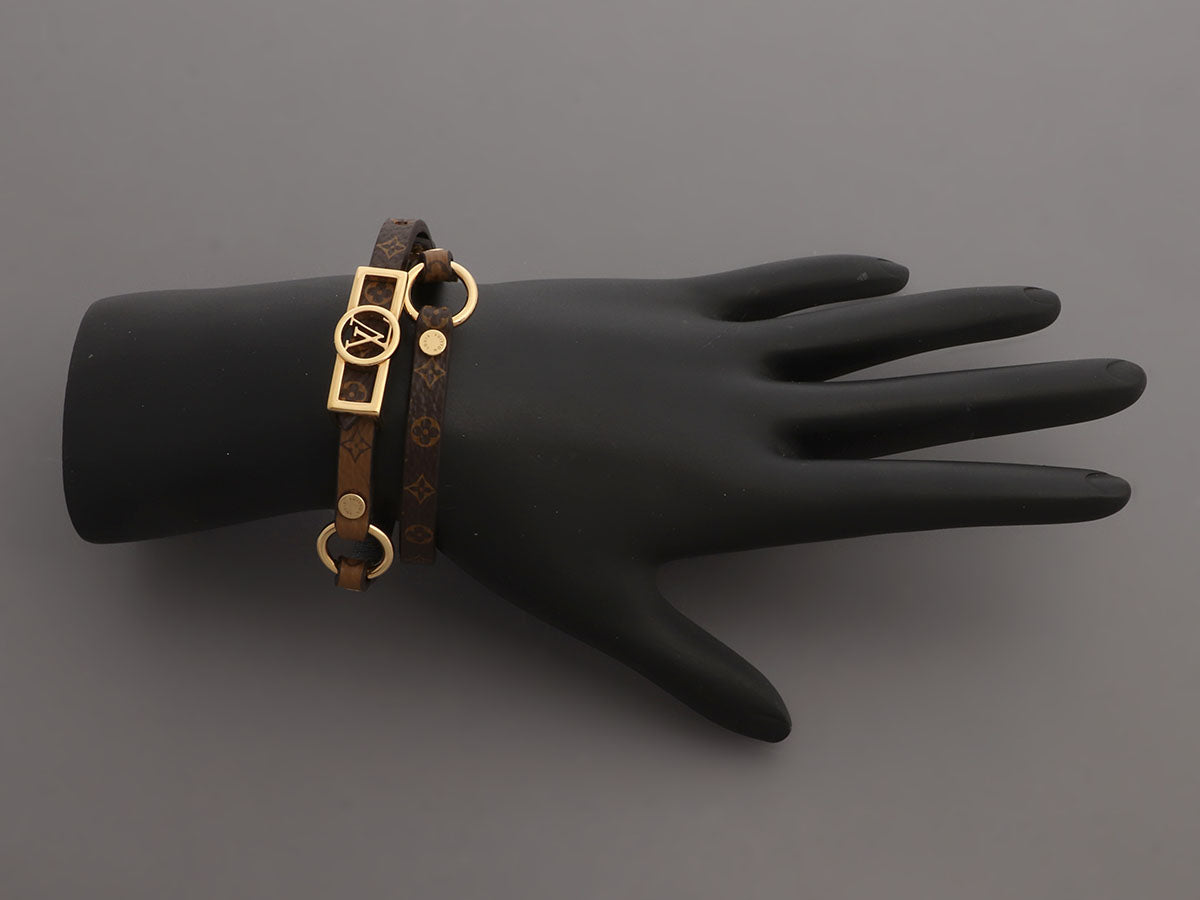 Wrap your wrist in designer style with Louis Vuitton’s Reverse Monogram Double Tour Dauphine Bracelet! Made of both tan and brown coated canvas and gold hardware, this slim bracelet measures 0.25 inches wide and fastens with a peg-in-hole buckle in the form of a gold rectangular logo like those found on the Dauphine bag. Brand new with a dustbag and box, it makes coordinating your accessories a snap!