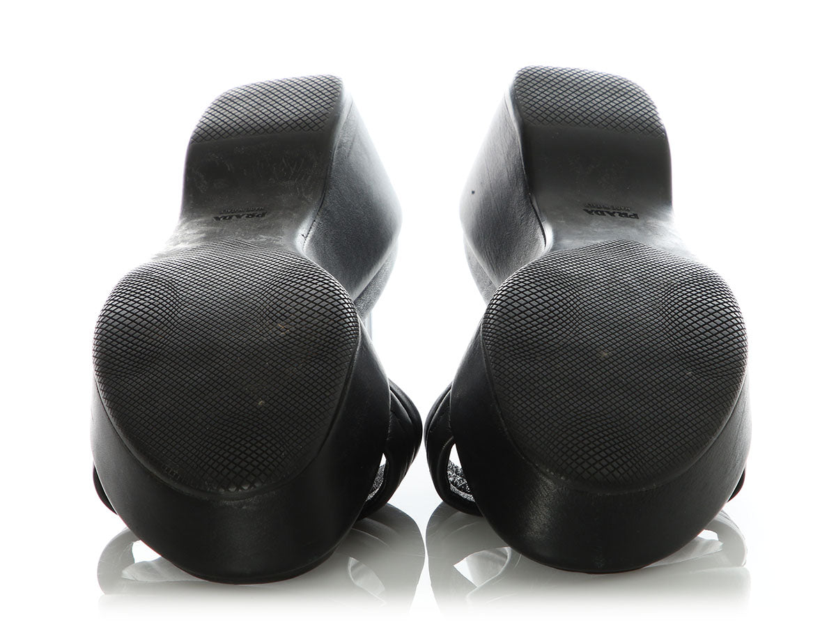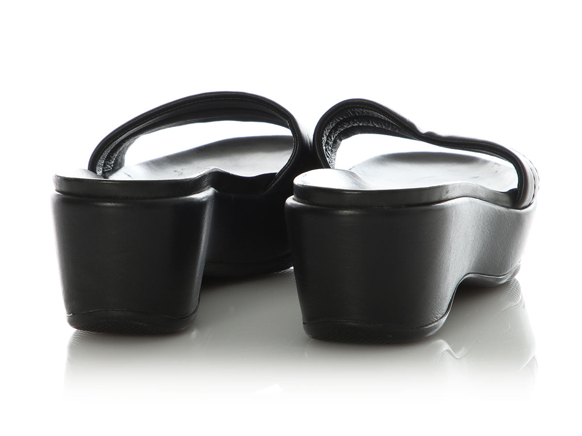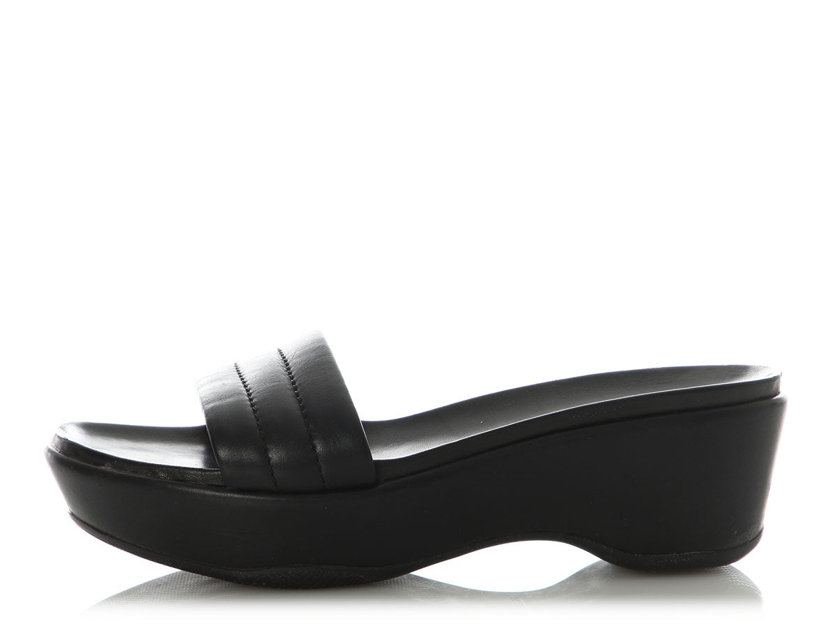 Prada Sport’s Black Padded Leather Platform Mules bring cushy comfort to every step! With 2.25-inch heels and 1-inch platforms, they slip on and are made of black leather with padded, quilted straps over your feet, and leather inners and manmade soles. In good condition, they have wear on the uppers, inners, and soles. These sandals are an easy way to elevate warm days with carefree style!