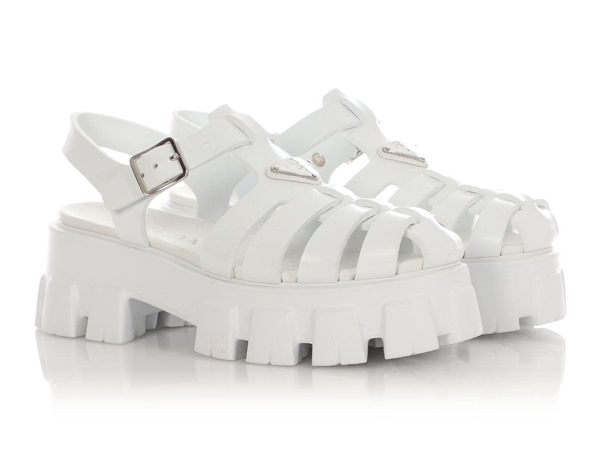 Prada’s White Monolith Sandals bring bold style with a surprisingly lightweight feel! Made from white EVA plastic, these chunky sandals feature white enamel logo plates on the front, silver buckle closures at the sides for an adjustable fit, and rubber lug soles. In great condition and never worn, they have a few tiny dark marks from storage. These sandals are proof that practical can still be fashion-forward!