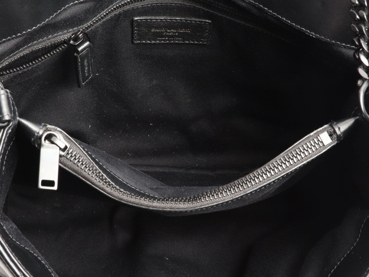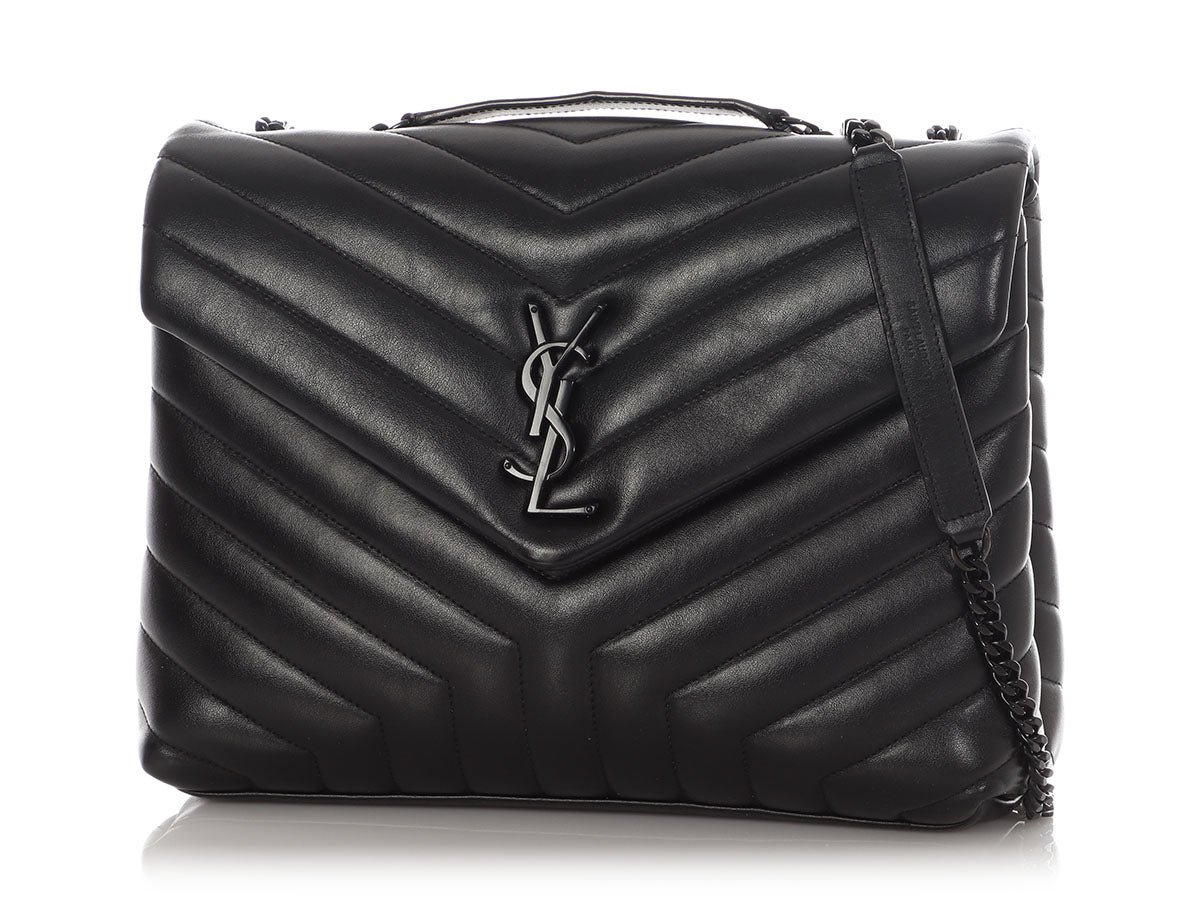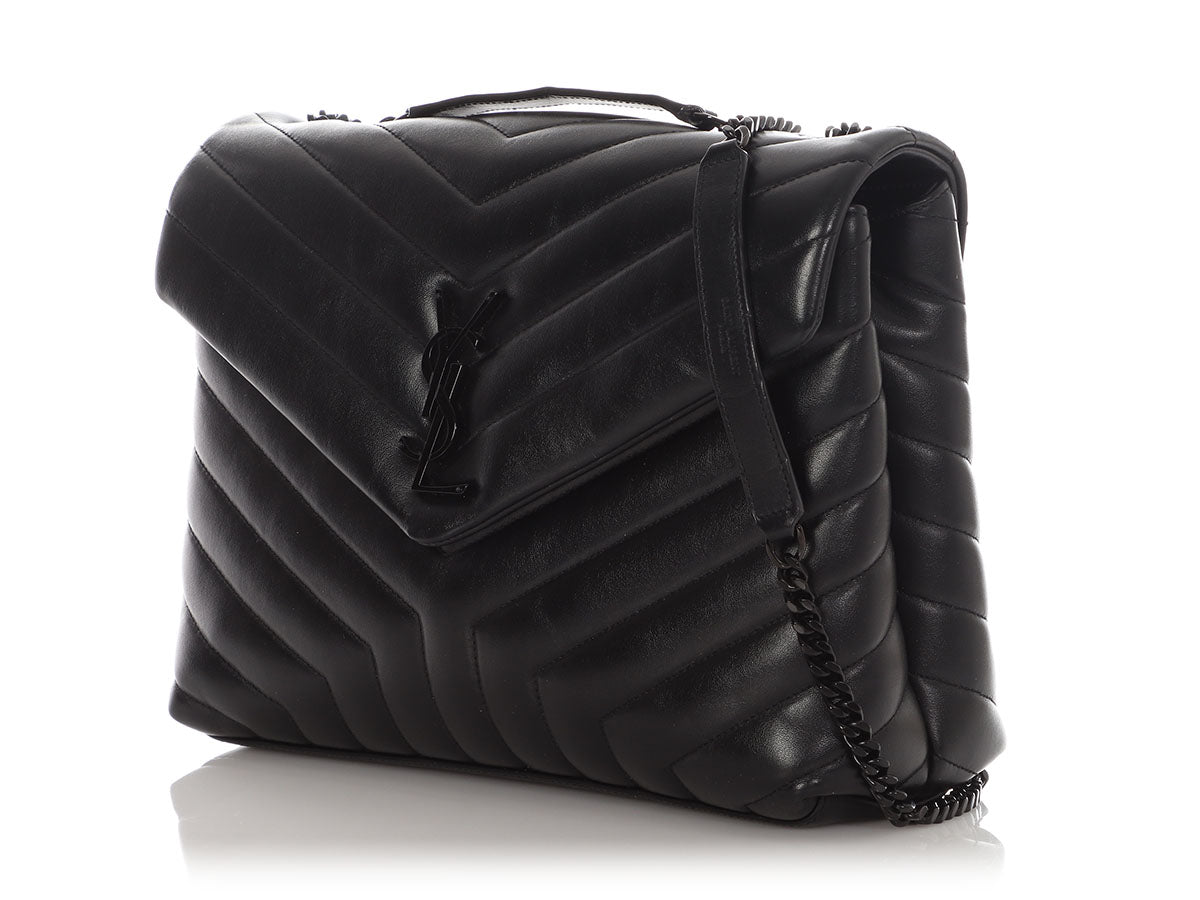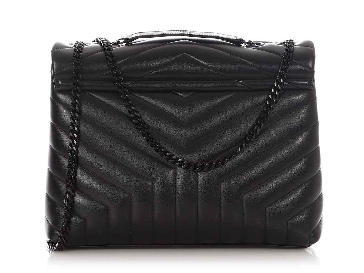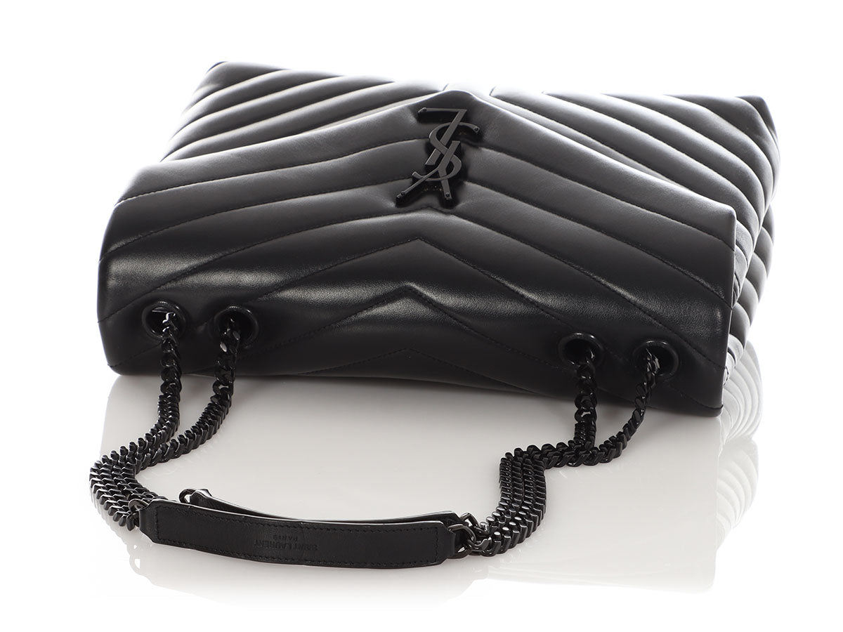 Saint Laurent’s Medium So Black Matelassé Calfskin Loulou is a sleek, monochrome beauty! Made of black quilted calf leather with blackened hardware, it features a tonal YSL monogram on the front and a leather-topped chain strap that can be worn doubled with a 10.25-inch drop or long with an 18-inch drop. The flap secures with a magnetic snap, opening to reveal a black fabric-and-leather interior with a central zipped pocket and one zipped pocket on the back wall. In very good condition with a dustbag, it has faint wear on the corners, light wear inside, and scratches on the hardware (mostly on the snaps) and underside of the flap. This roomy Loulou is equal parts sophisticated and cool, perfect for day or night!