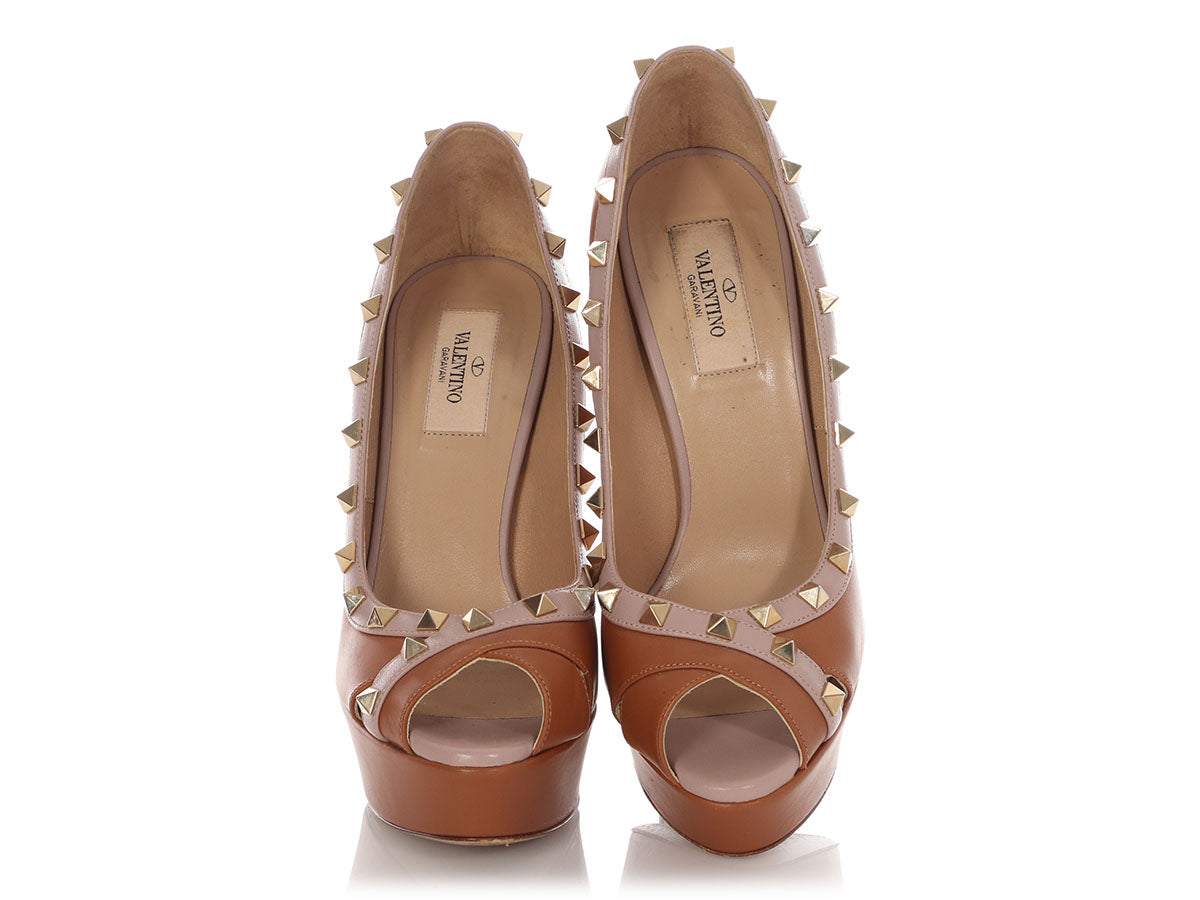 Valentino’s Tan and Lavender Rockstud Peep-Toe Platform Pumps stand taller than tall with sky-high 5.5-inch stiletto heels and 1.25-inch platforms! Made of light-brown leather with beige-leather inners and soles, they’re trimmed in pastel purple and edged in gold pyramid studs. In very good condition, they have wear on the soles, scratches on the leather and hardware, and some indentations under the studs on the right shoe. The open toes give just a peek at your pretty pedicure!