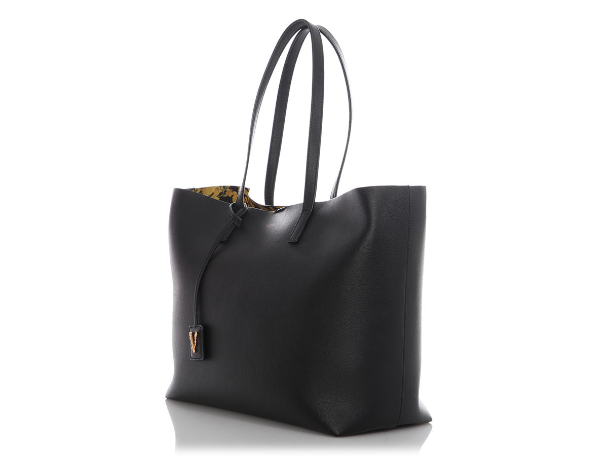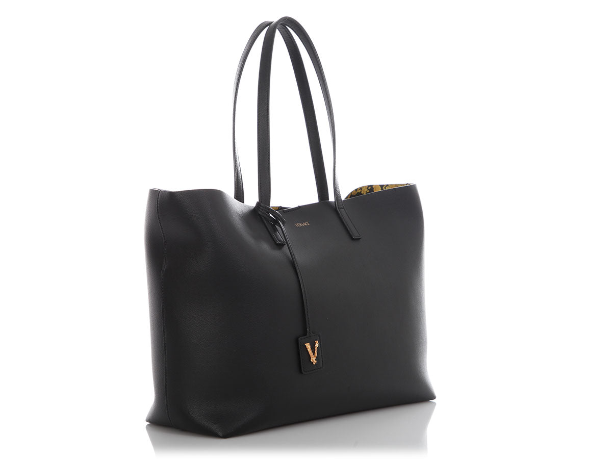 Versace’s Black Leather Virtus Tote fabulous everyday shopper! Crafted from thick, grained black leather with gold logo heat stamping on the front, this roomy carry secures with a magnetic snap and features leather handles with a 9-inch drop. The interior is lined in Baroque-print leather for an extra hit of Versace drama and includes a detachable zipped pouch on a leash. In excellent condition with a dustbag, logo bag charm, and info card, it has cracking on the glazing at the top edges and a scratch on the zip pouch. This beauty is just the right size for workdays or weekends with a touch of gold-tone hardware for a subtle glow!