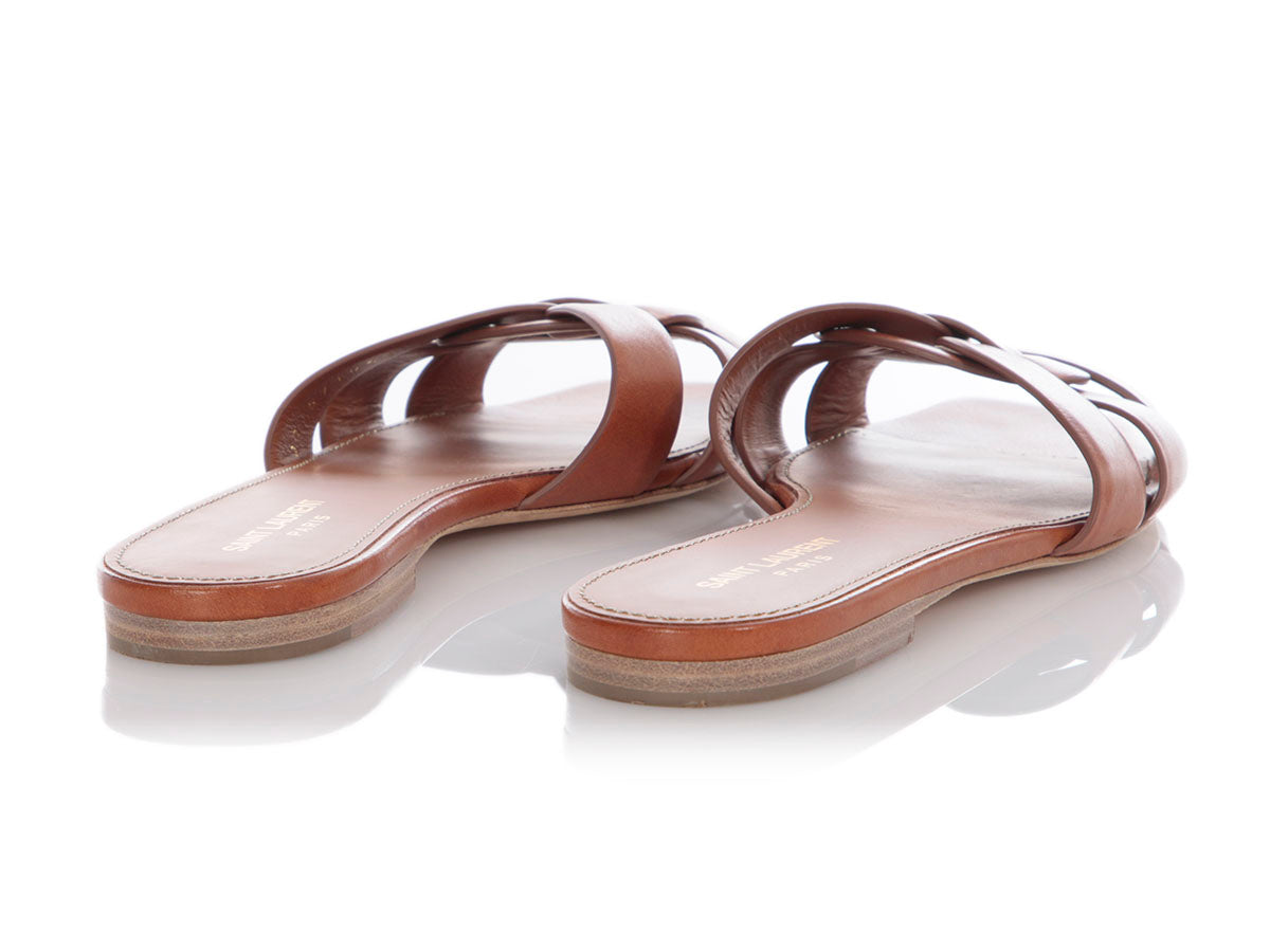 Saint Laurent’s Tan Leather Slides are a woven, wonderful warm-weather style! Made of tan leather, these flat sandals slip on with ease and feature squared-off toes, leather inners, and leather soles. In very good condition with wear on the soles, rubbing at the toes, and general scratching throughout, they’re a simple and chic addition to any sunny day!