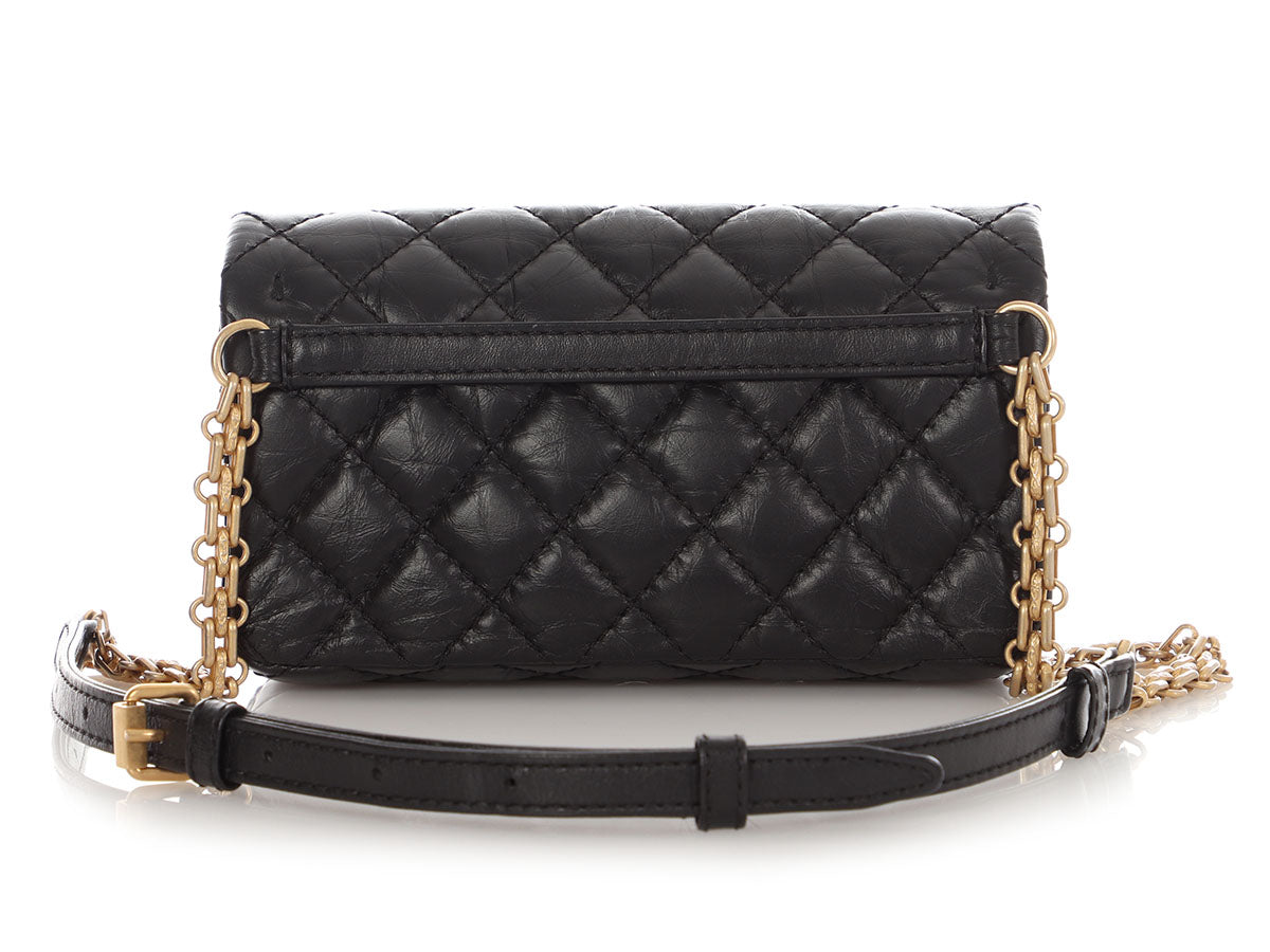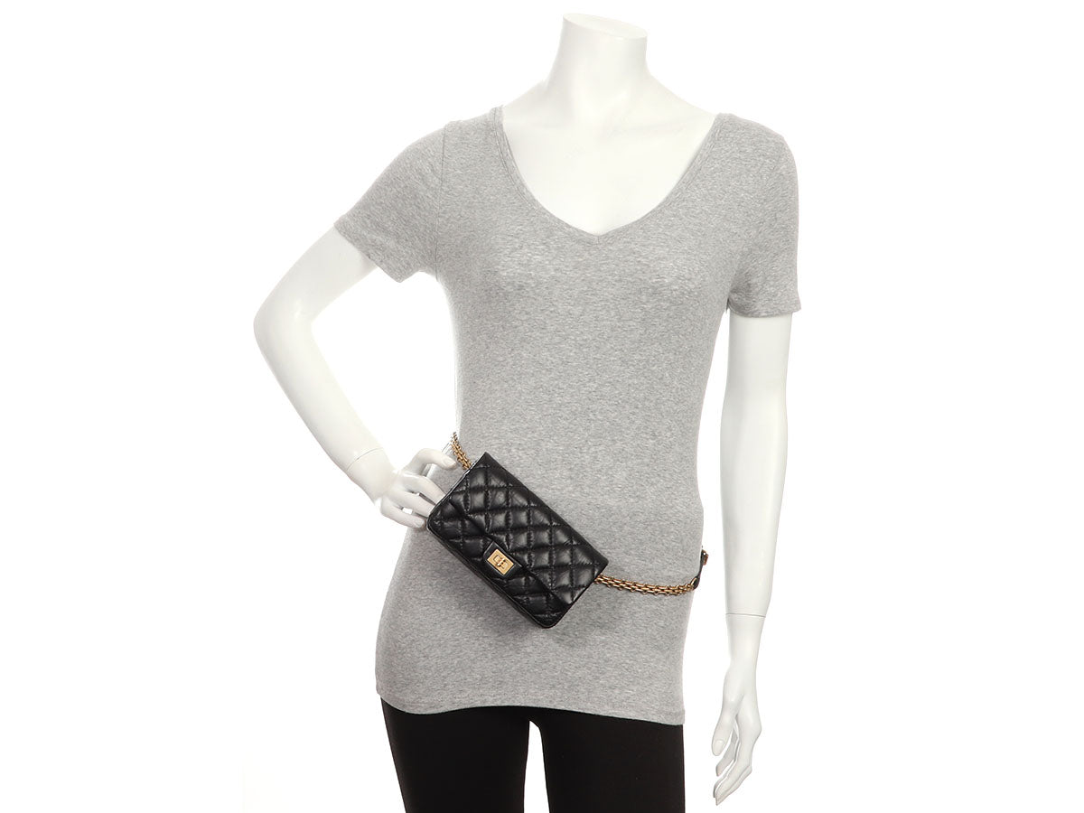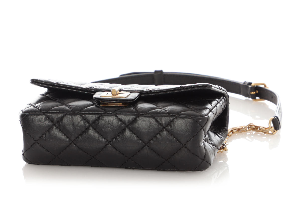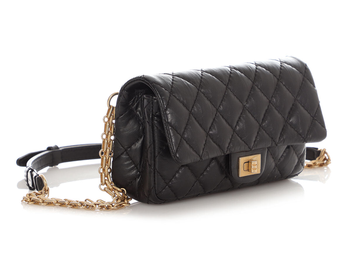 Chanel’s Black Quilted Aged Calfskin Reissue 2.55 Waist Bag can be worn around the middle or on the shoulder! It’s paired with antiqued gold-tone hardware in the Reissue turnlock that opens the flap to a slide pocket on the face. The black-leather interior comes with one slide pocket. In excellent condition from 2018-19, it has wear inside. The Reissue chain with leather shoulder pad fits a 28-inch waist approximately but it is adjustable!