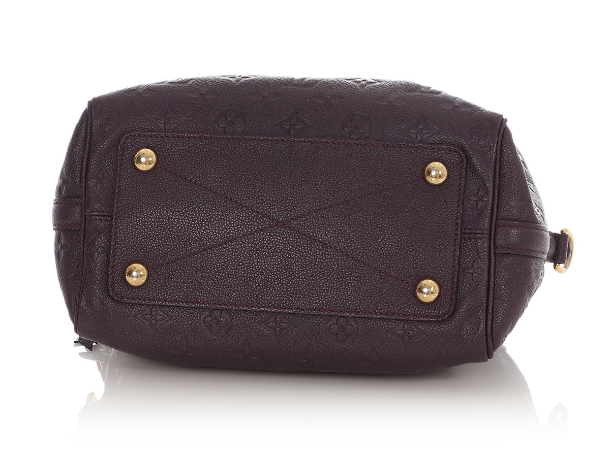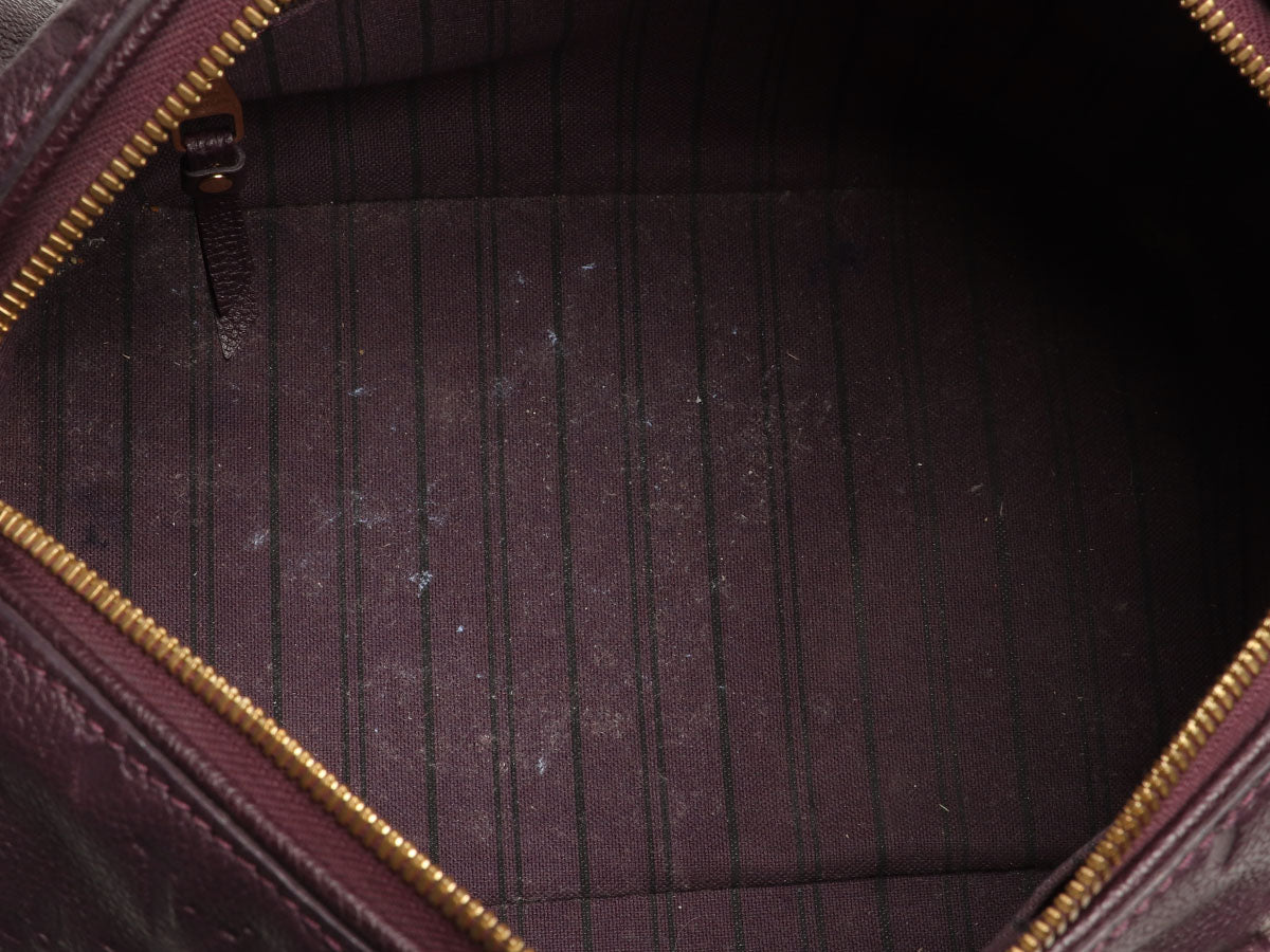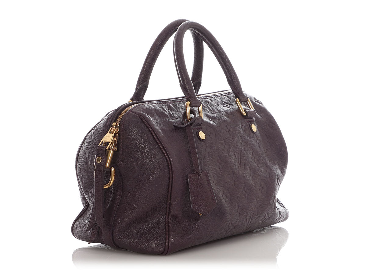 Louis Vuitton’s Aubergine Empreinte Speedy Bandoulière 25 is a gorgeous bag in an exquisite color! Made of thick, monogram-embossed purple leather with a 3.5-inch drop to the rolled handles and a 21-inch drop shown on the adjustable tonal shoulder strap, it secures with a lockable double zipper, opening to a purple striped fabric interior and one zipped and two slide pockets. In good condition with a lock, keys, and clochette, the corners and edges are rubbed, the glazing on the handles and strap is melting a bit, the hardware is scratched and losing its gold tone, there are stains inside, and it has a slight musty smell. The color is just beautiful, making it a fun bag to flaunt!